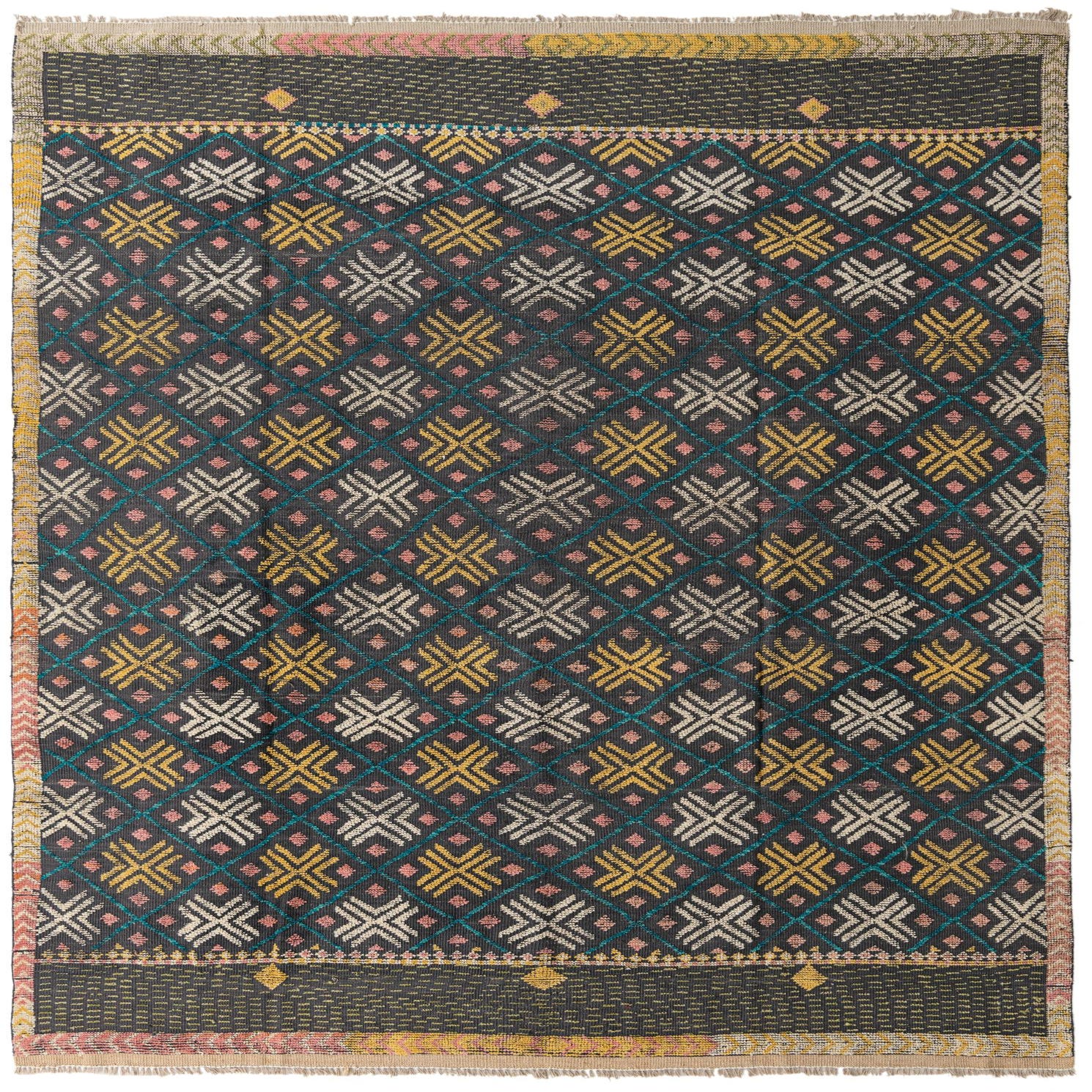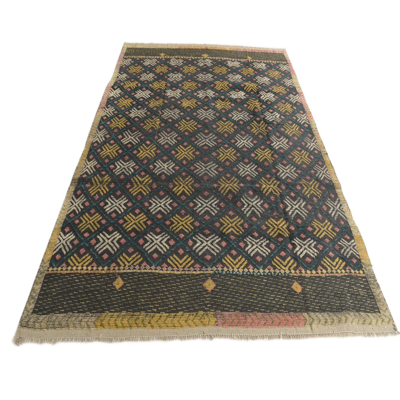 Primary color is Dark Gray. Colors in this rug include: Dark Gray, Blue, Ivory, Yellow, Puce.