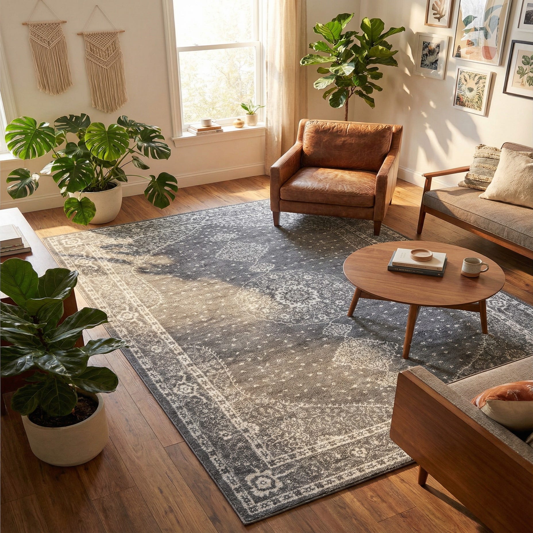 Machine made from 100% polypropylene, the rug has a low, dense pile that feels smooth and slightly cushioned underfoot and shows the pattern with clear definition. Its restrained colorway and lived-in finish make it a good anchor for a neutral living room, a dining area under a simple table in a modern farmhouse scheme, or layered at the foot of the bed in a softly styled bedroom. It also pairs nicely with metal and wood furnishings in an industrial loft or with clean-lined sofas and textured throws in a transitional seating area.