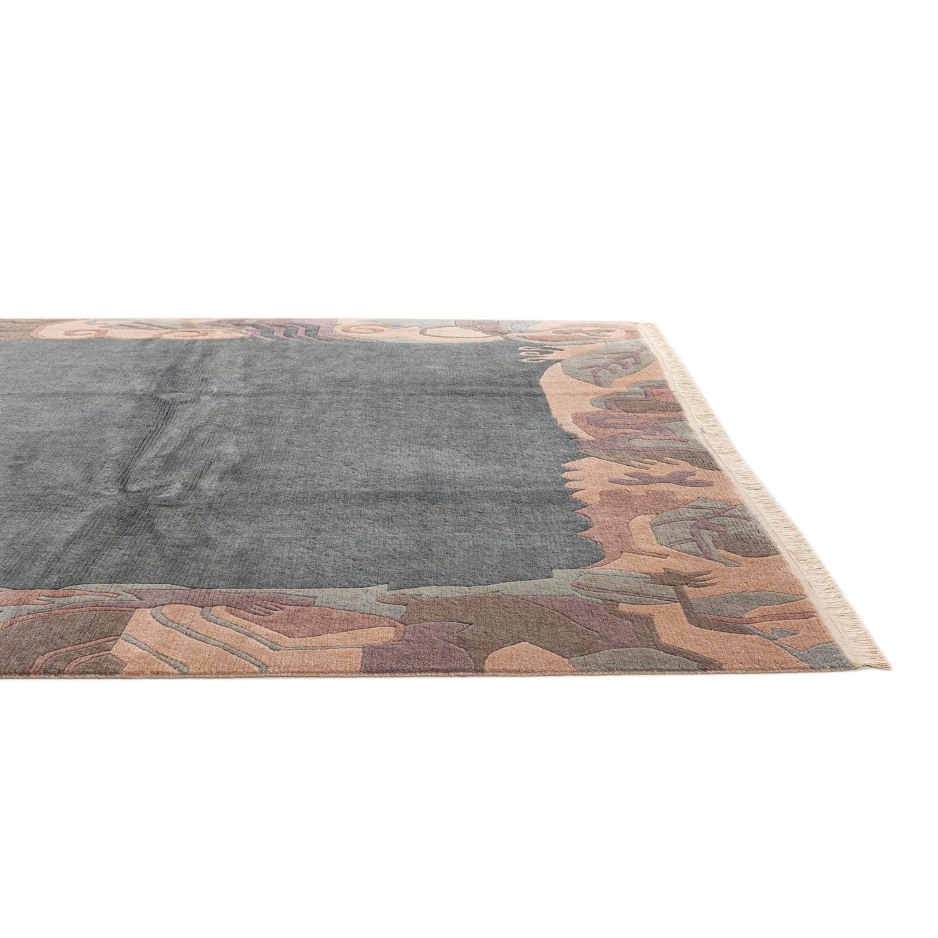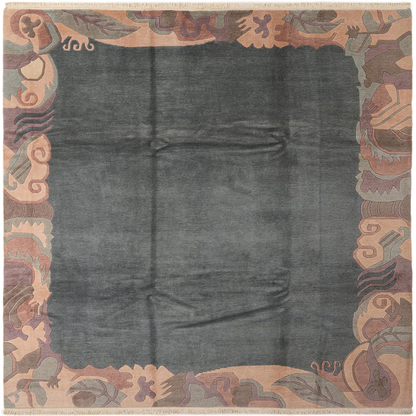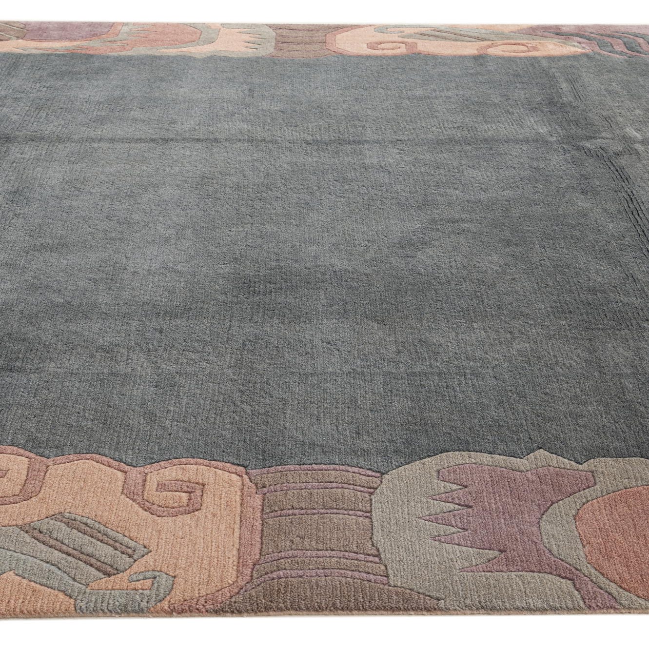 An 8x11 rectangular gray wool rug with a modern oriental border in muted peach, plum, and sage tones.