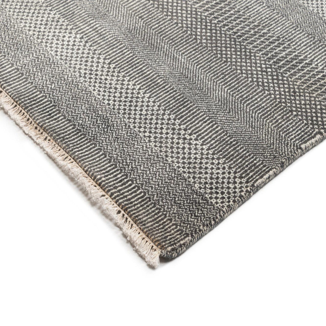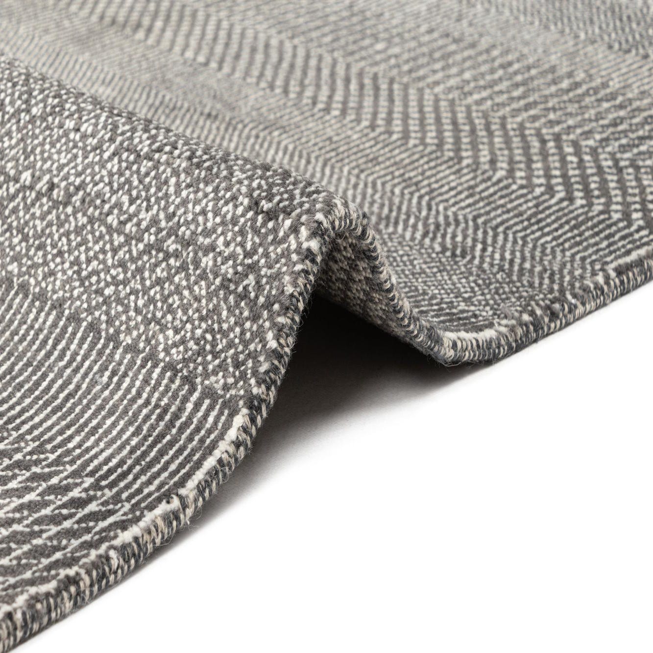 A banded, handwoven design gives this rug a quietly modern look: a dark gray background is threaded with lighter gray and ivory yarns that form narrow horizontal stripes and small woven motifs—herringbone finishes, tiny dot-like weaves and fine dashed lines—creating depth without a busy pattern. The result is a contemporary, understated stripe that reads tailored and calm, with the clear character of hand craftsmanship. Hand made of 100% wool, the construction highlights subtle variations in the weave that add visual interest up close.