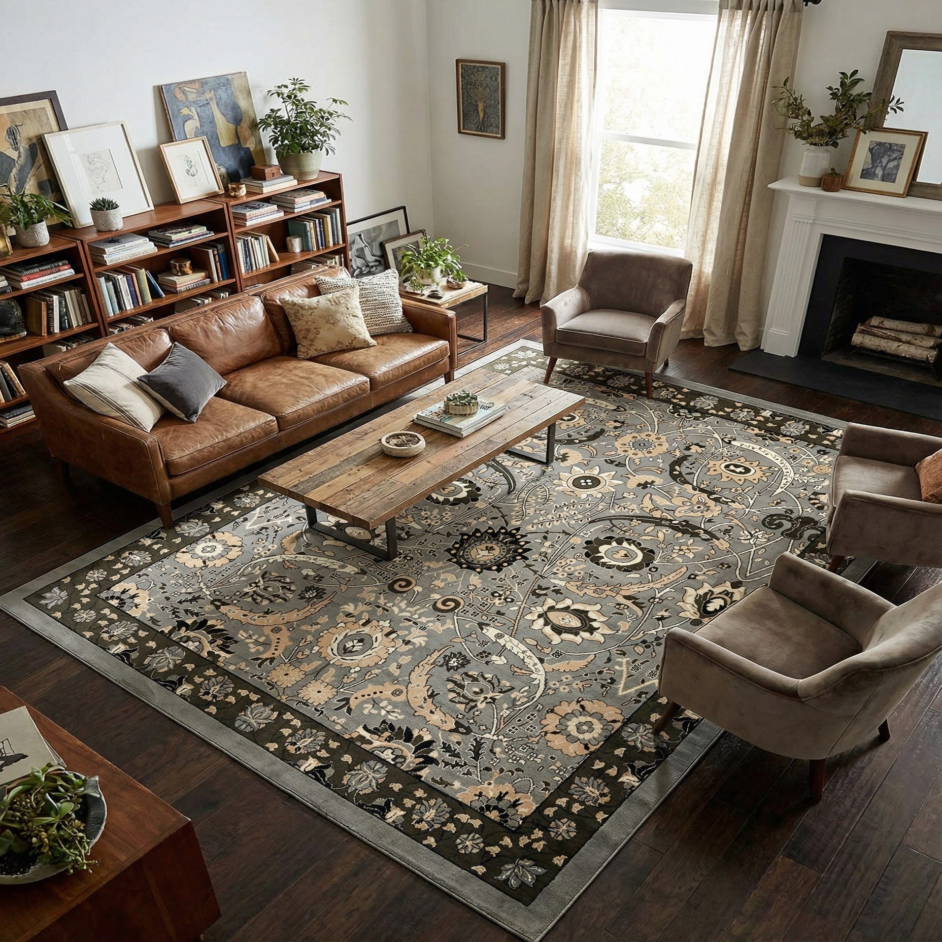 Given its blend of neutral and dark tones, this rug is versatile enough to complement a variety of interior styles. Its timeless pattern makes it well-suited for traditional settings, while the contemporary color scheme allows it to seamlessly integrate into modern and transitional decors as well. This rug would be well-placed in a formal living room, dining area, or under a master bed, providing a foundation of elegance and an anchor for your design palette.