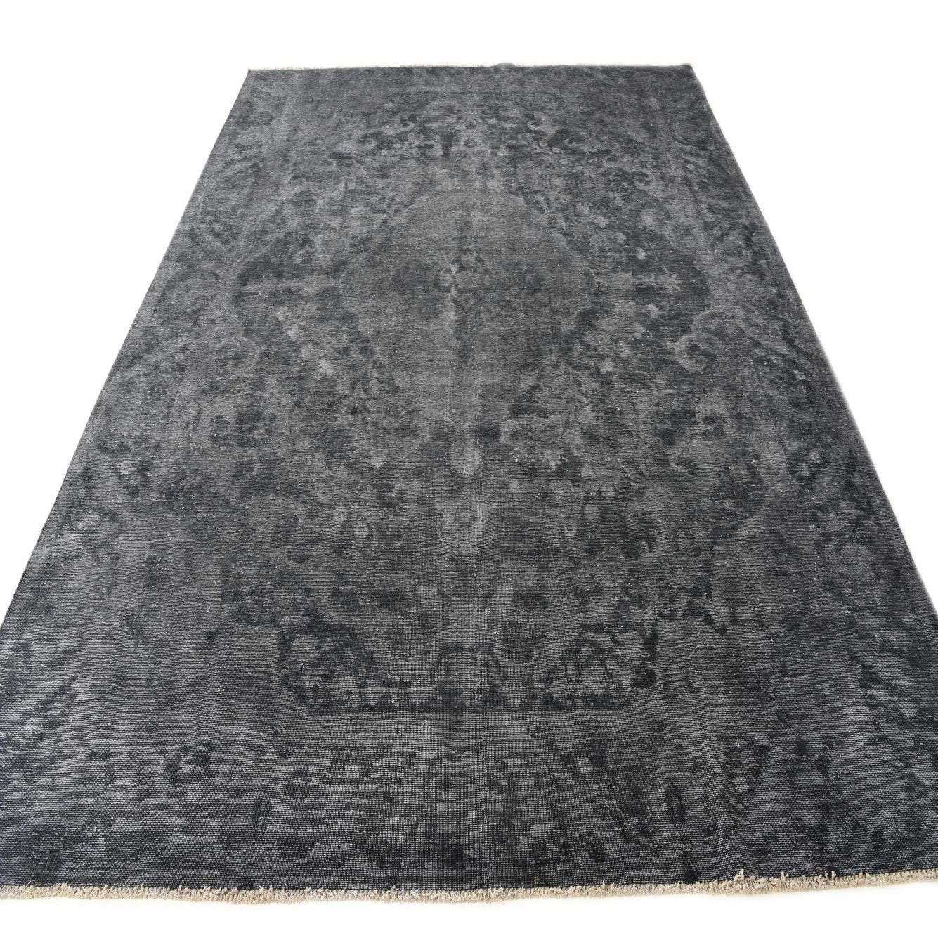 A 9x12 rectangular gray wool rug featuring a distressed Persian-style medallion and floral pattern, ideal for a living room.