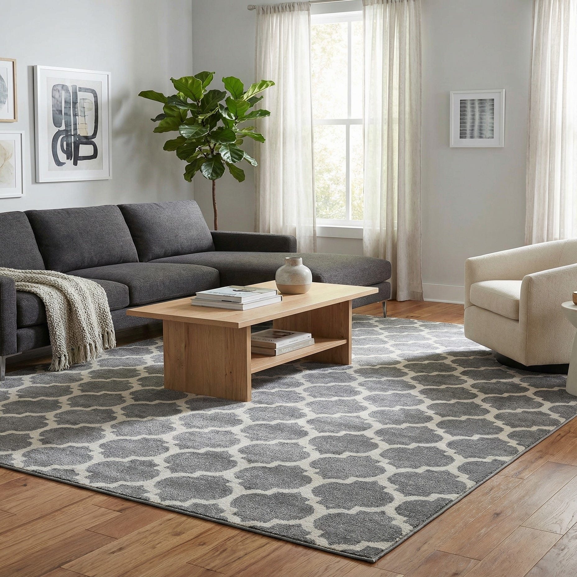 A rectangular gray area rug with a repeating white modern trellis pattern, suitable for a living room or bedroom.