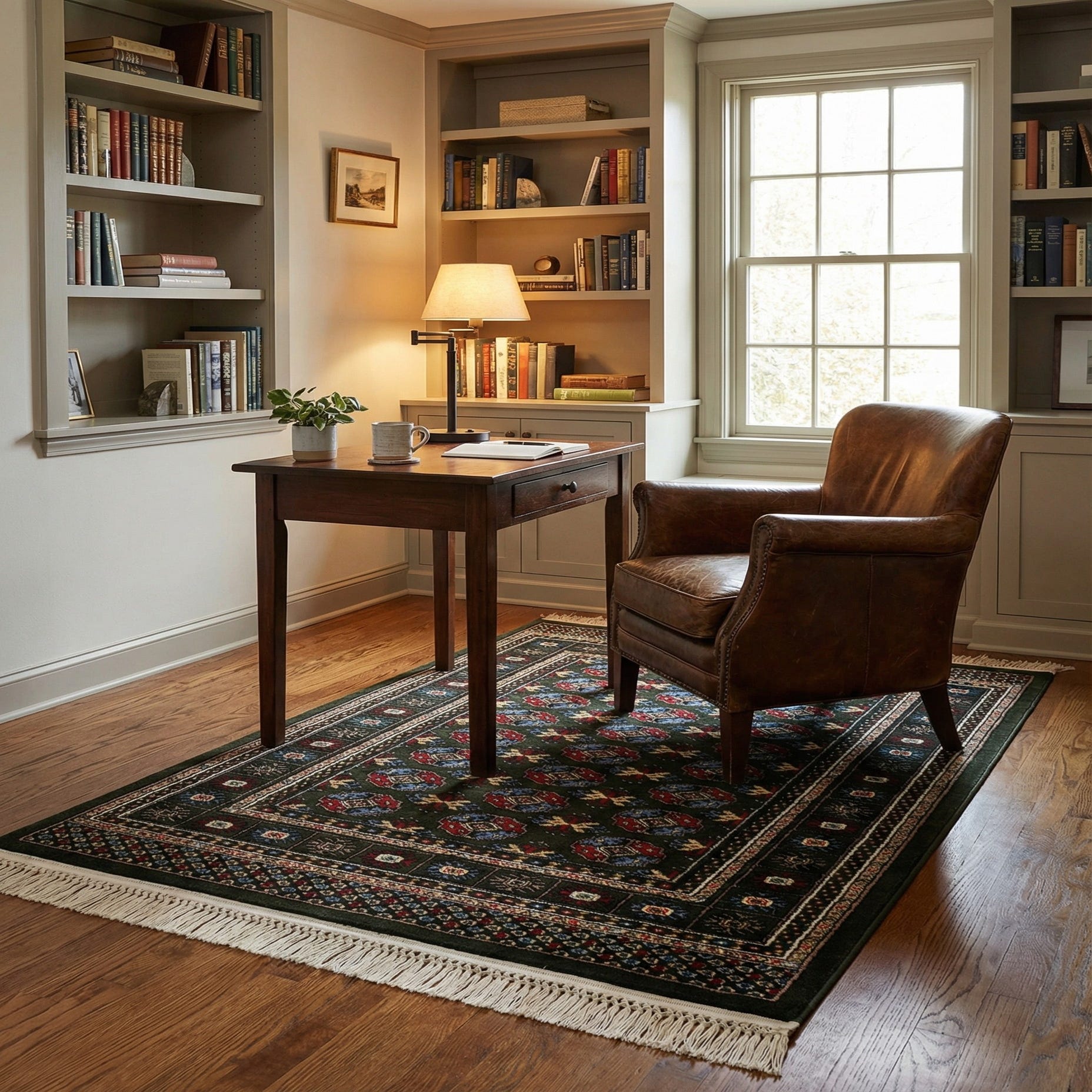 This Bokhara collection rug features a timeless oriental pattern that brings a sense of tradition and sophistication to any space. Machine-woven from 100% polypropylene, it offers durability and a shed-free experience. The rug's rich dark green background is complemented by an intricate array of motifs in beige, black, blue, brown, red, and ivory, creating a captivating visual that is both elegant and balanced.