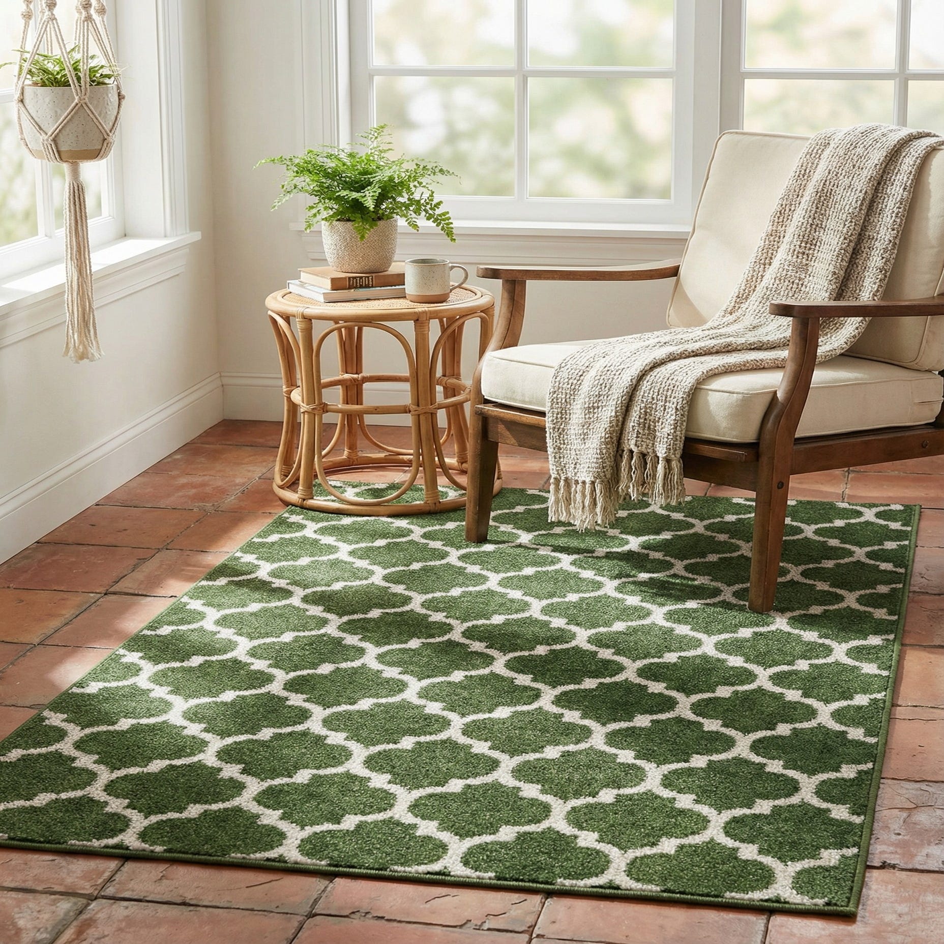 Machine-made from 100% polypropylene, the rug has a low-to-medium pile with a slightly plush hand that feels comfortable underfoot while holding a tailored appearance. The pattern and background offer a gentle textural contrast that you can both see and feel. This piece works well in entryways or as an accent in a living room or home office, pairs nicely with warm wood furniture and brass or black metal accents, and complements neutral sofas or patterned pillows for a layered look. It also functions as a grounding element in a modern farmhouse or transitional bedroom, bringing color and pattern without demanding attention.
