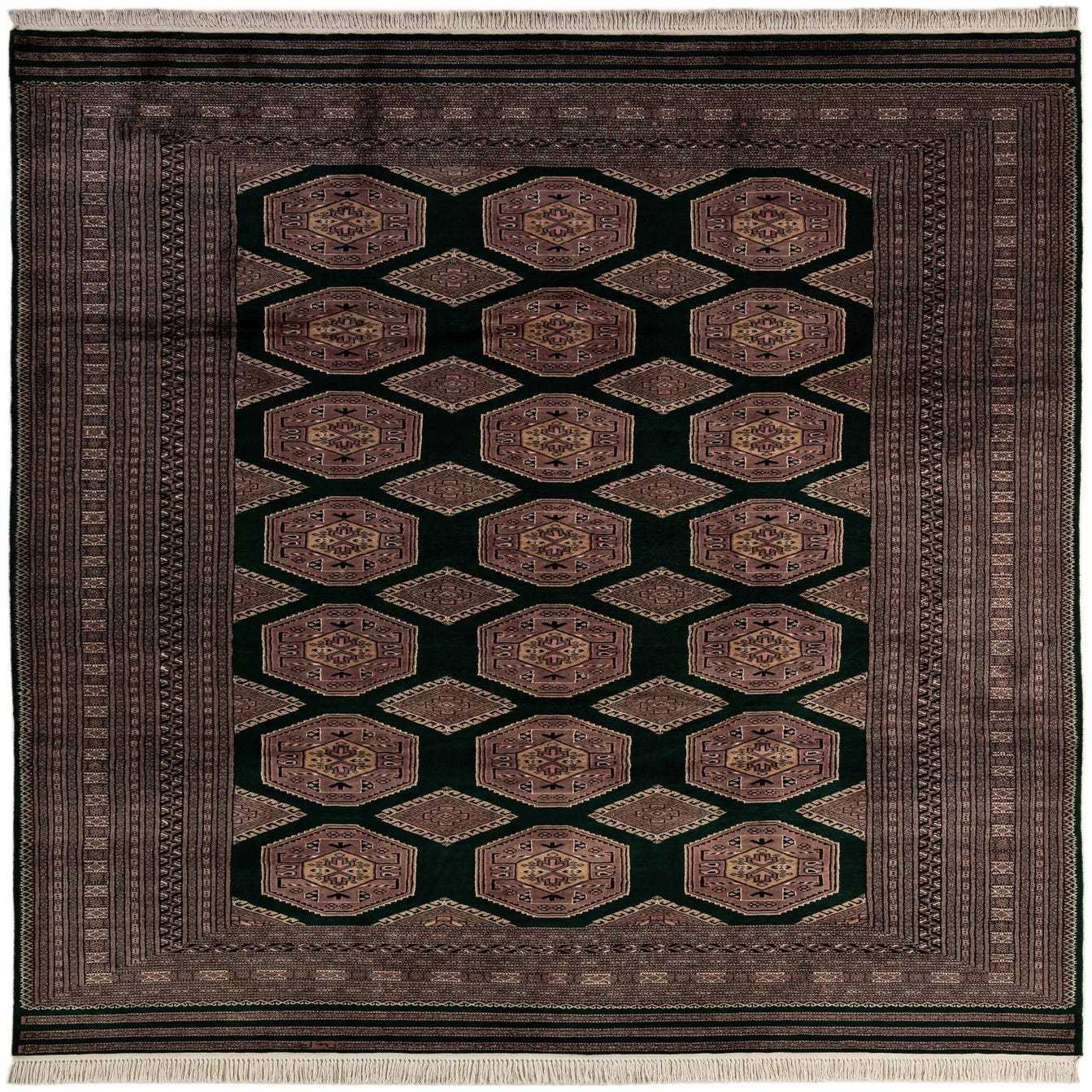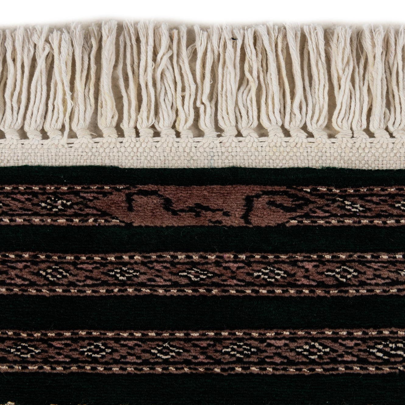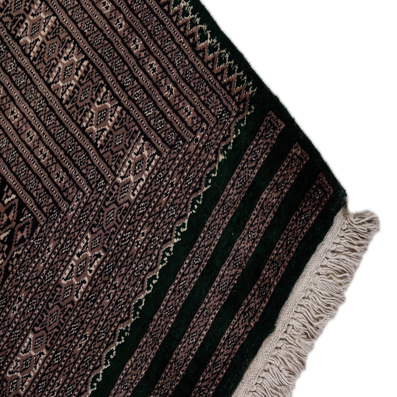 A 7x10 rectangular Bokhara rug featuring a deep green field with repeating brown and beige tribal medallion patterns, bordered by intricate traditional designs and white fringes.