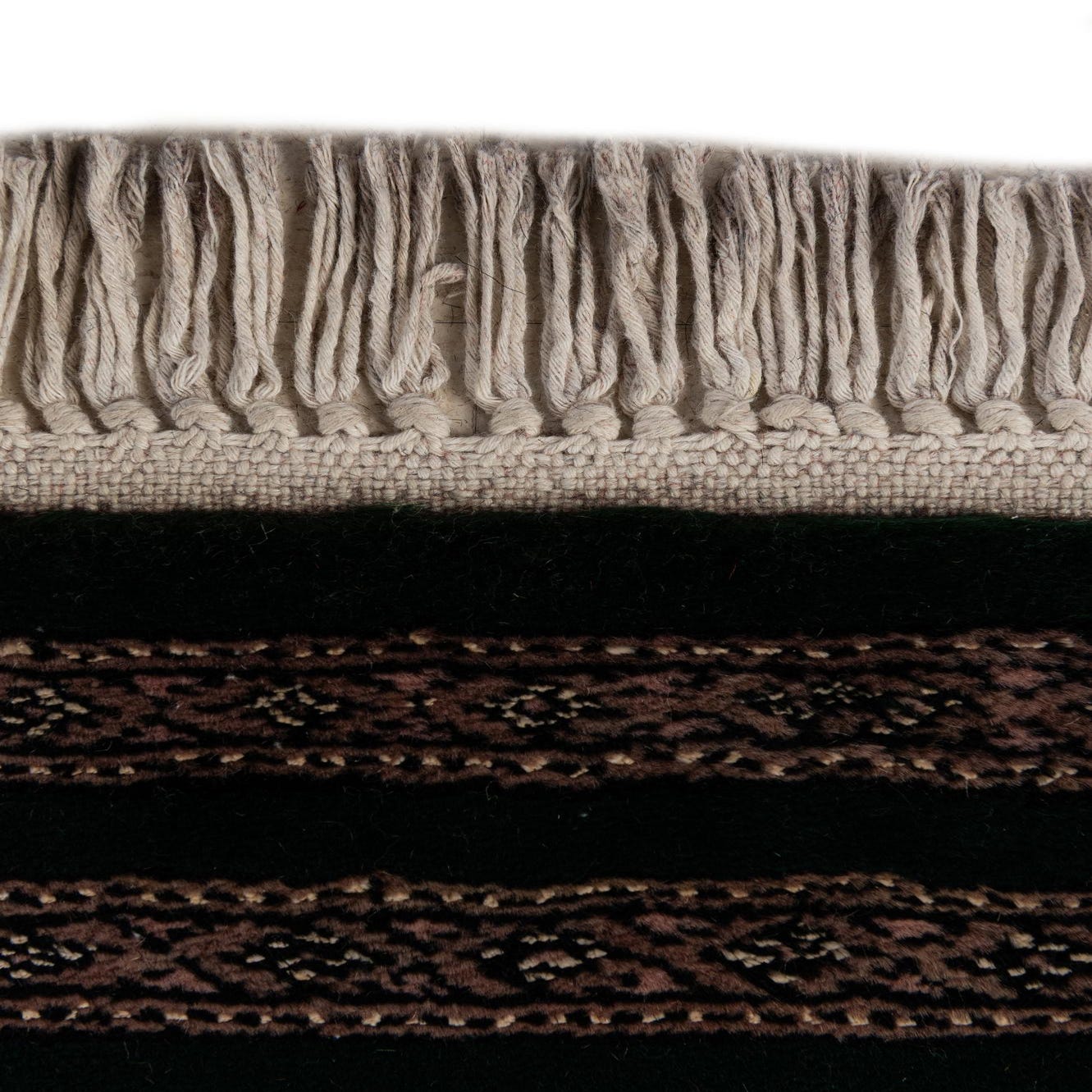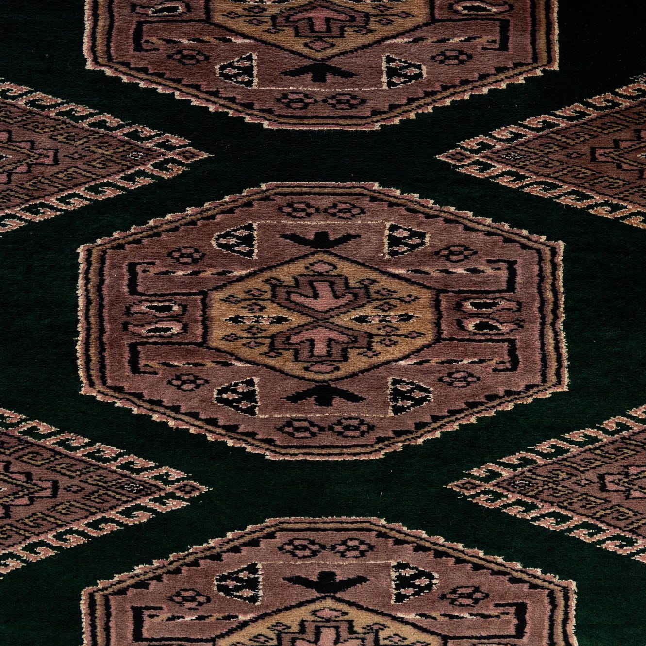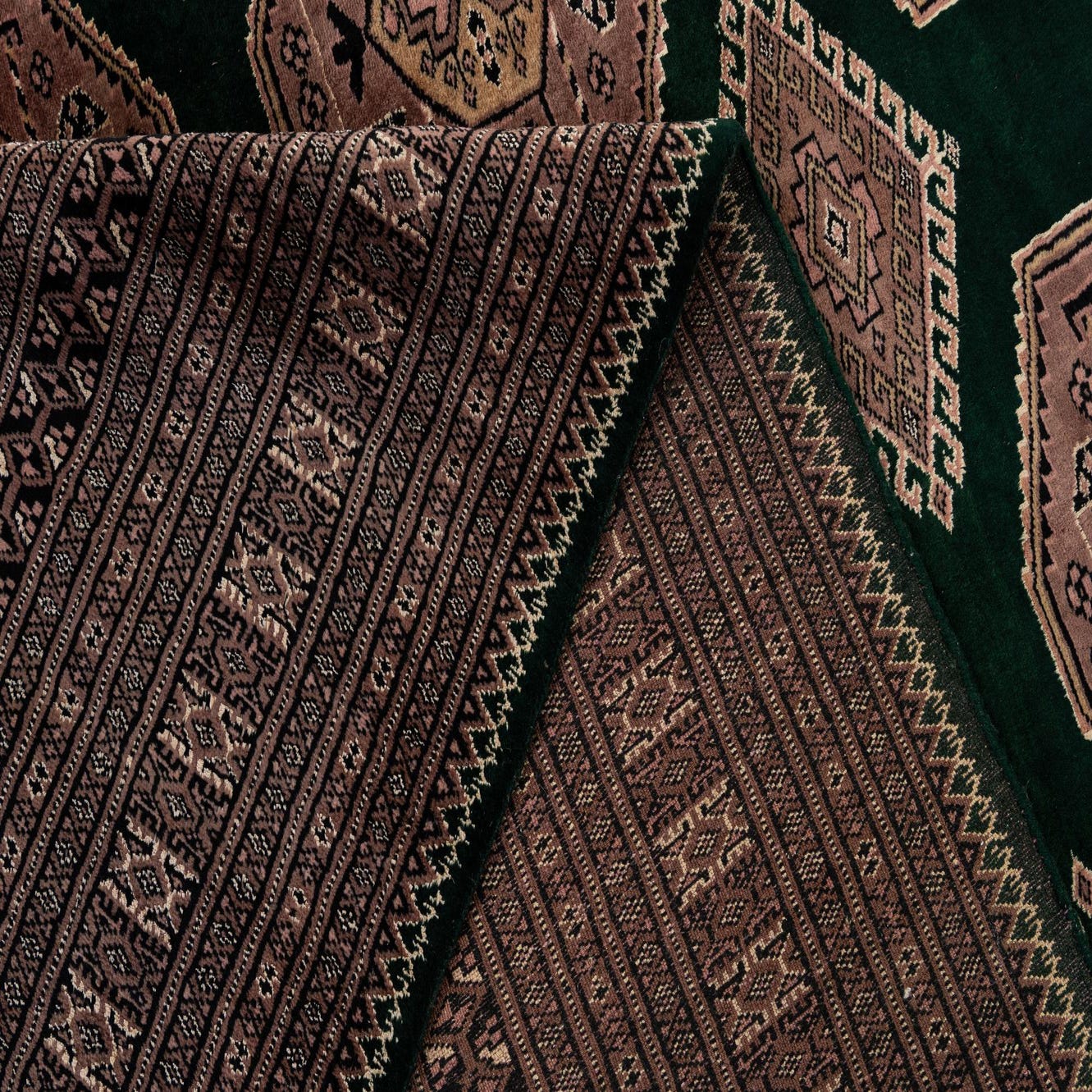 A 7x10 rectangular Bokhara rug featuring a deep green field with repeating brown and beige tribal medallion patterns, bordered by intricate traditional designs and white fringes.