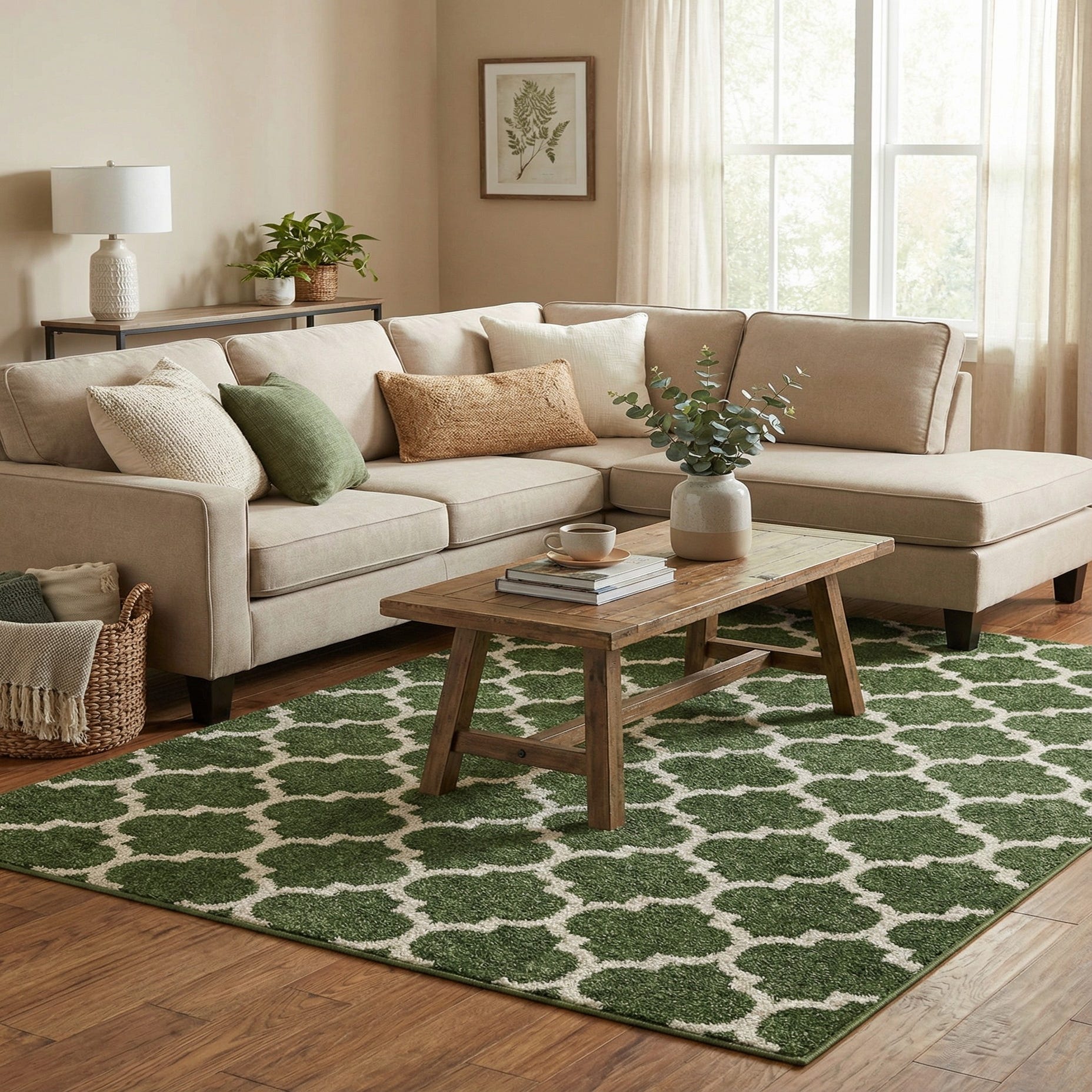 A 7x10 rectangular green area rug featuring a repeating white modern trellis pattern, suitable for a living room.