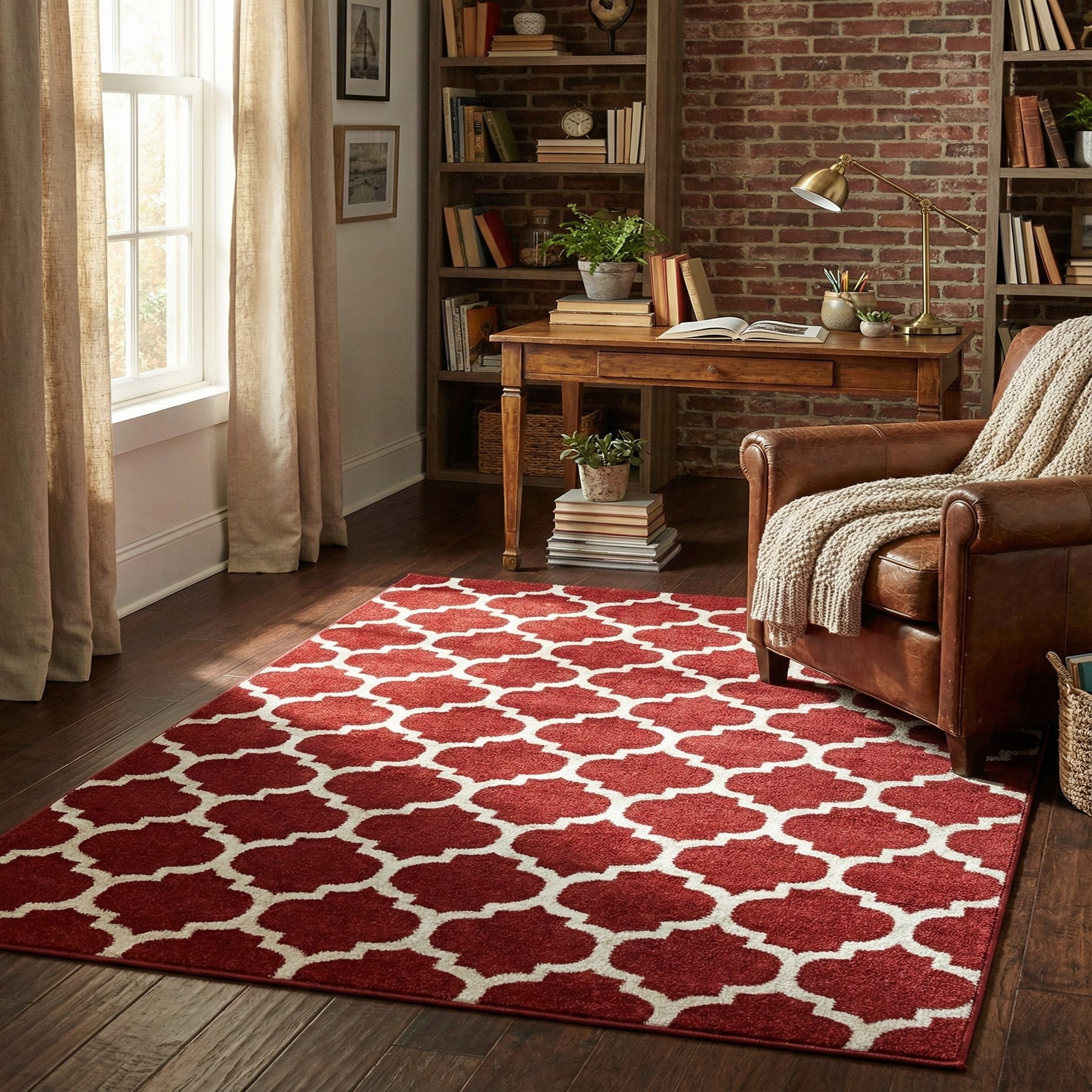 A bold arabesque trellis pattern in crisp beige sits over a rich dark terracotta field, creating a balanced mix of geometric precision and warm color. Machine-made from 100% polypropylene, the rug has a low-to-medium cut pile that feels soft and slightly springy underfoot while holding clean, defined pattern edges. The contrast between the terracotta background and the beige motif gives the surface clear visual depth without adding weight.