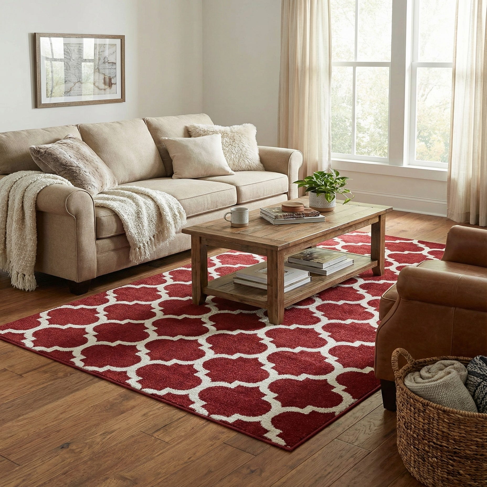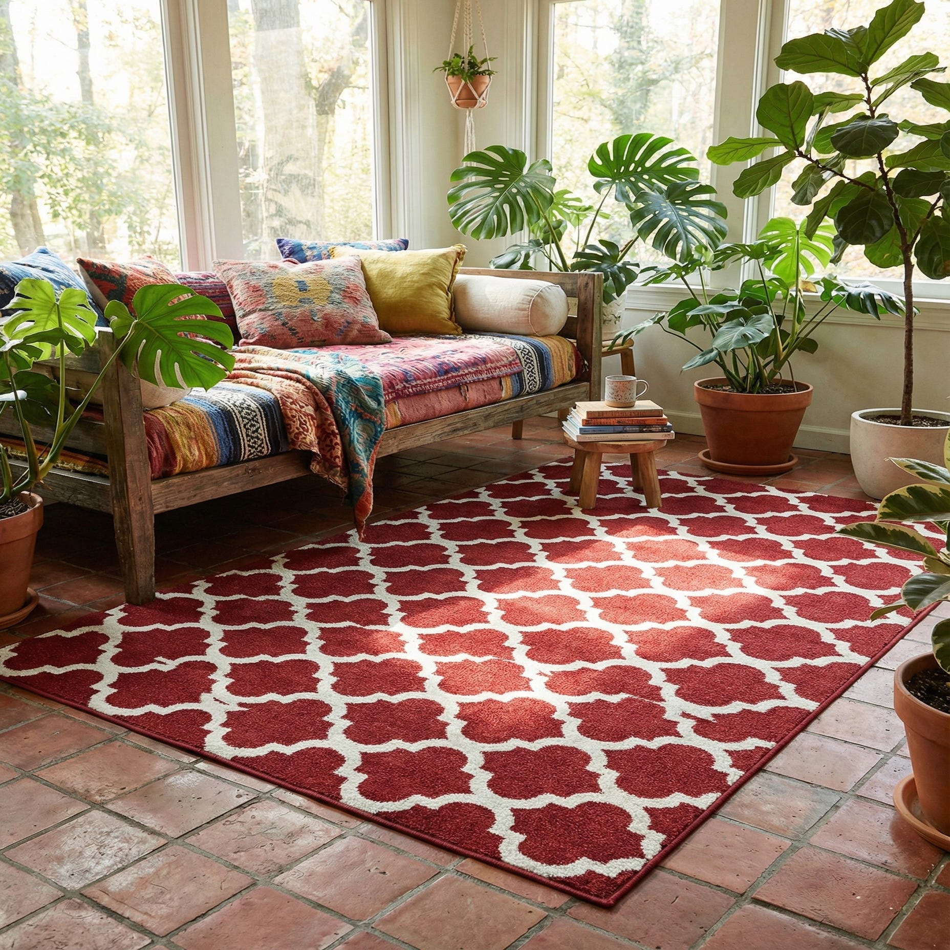 A warm dark terracotta field sets the stage for a repeating lattice of soft beige arabesque shapes, forming a balanced, geometric pattern with a nod to classic trellis designs. Machine-made from 100% polypropylene, the rug has a dense, low-to-medium pile that feels pleasantly cushioned underfoot while keeping the pattern crisp and well-defined. The contrast between the deep terracotta background and the clean beige motif creates visual depth without overwhelming a room.