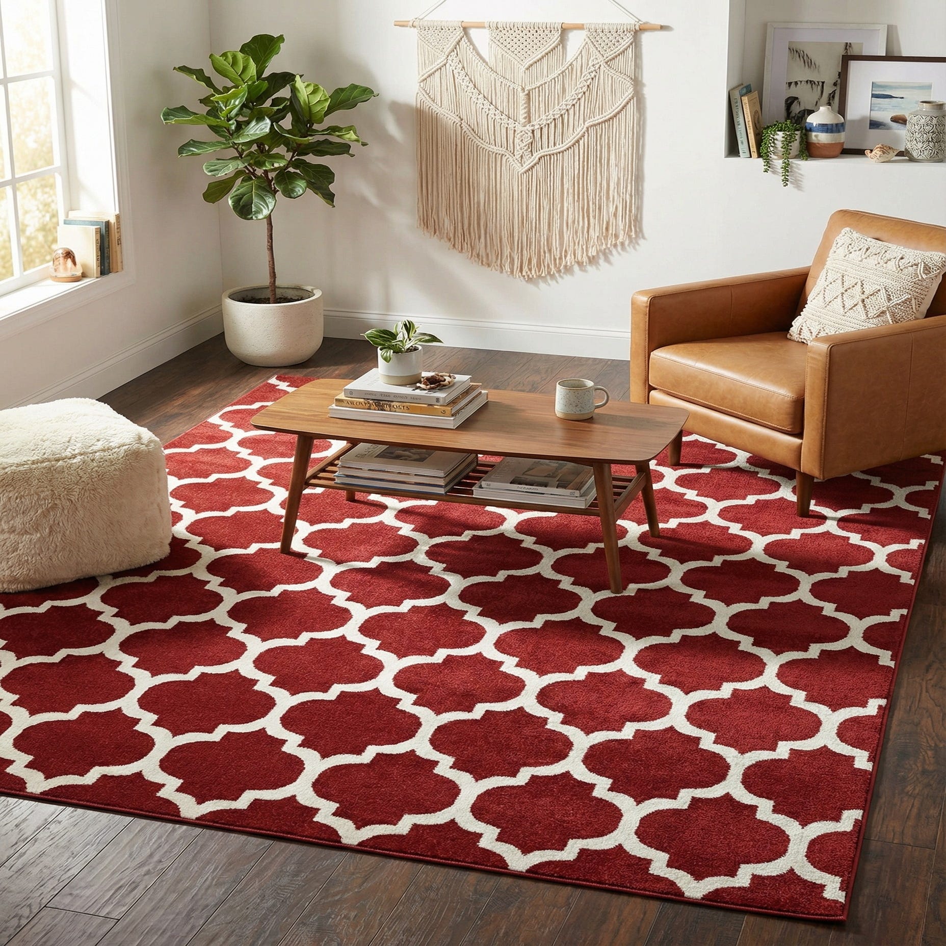 A bold Moroccan-inspired trellis pattern in soft beige sits over a dark terracotta background, creating a striking, structured look that balances warmth and geometry. The repeating quatrefoil shapes bring a rhythmic, contemporary feel while the two-tone palette keeps the design grounded. Machine-made from 100% polypropylene, the pile has a low-to-medium profile with a smooth, slightly cushioned hand that feels comfortable underfoot and holds the pattern definition sharply.