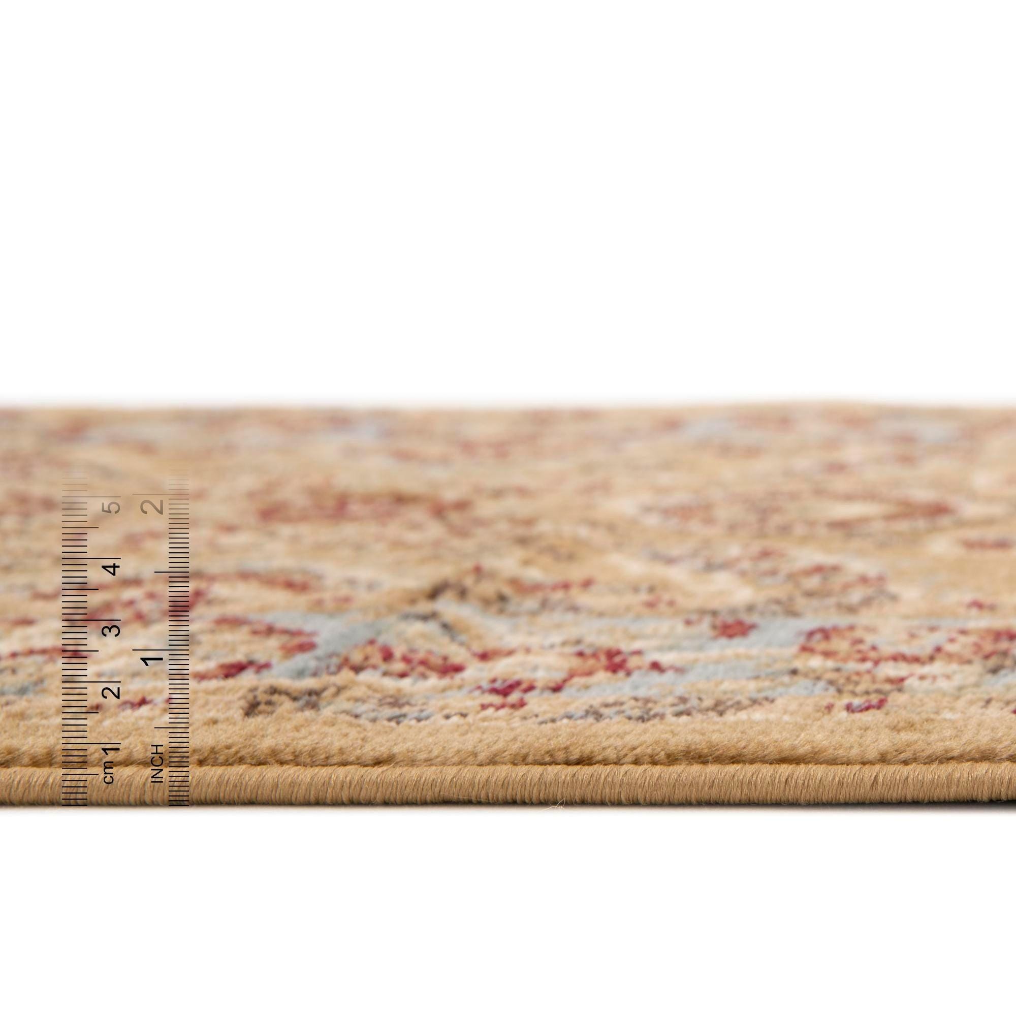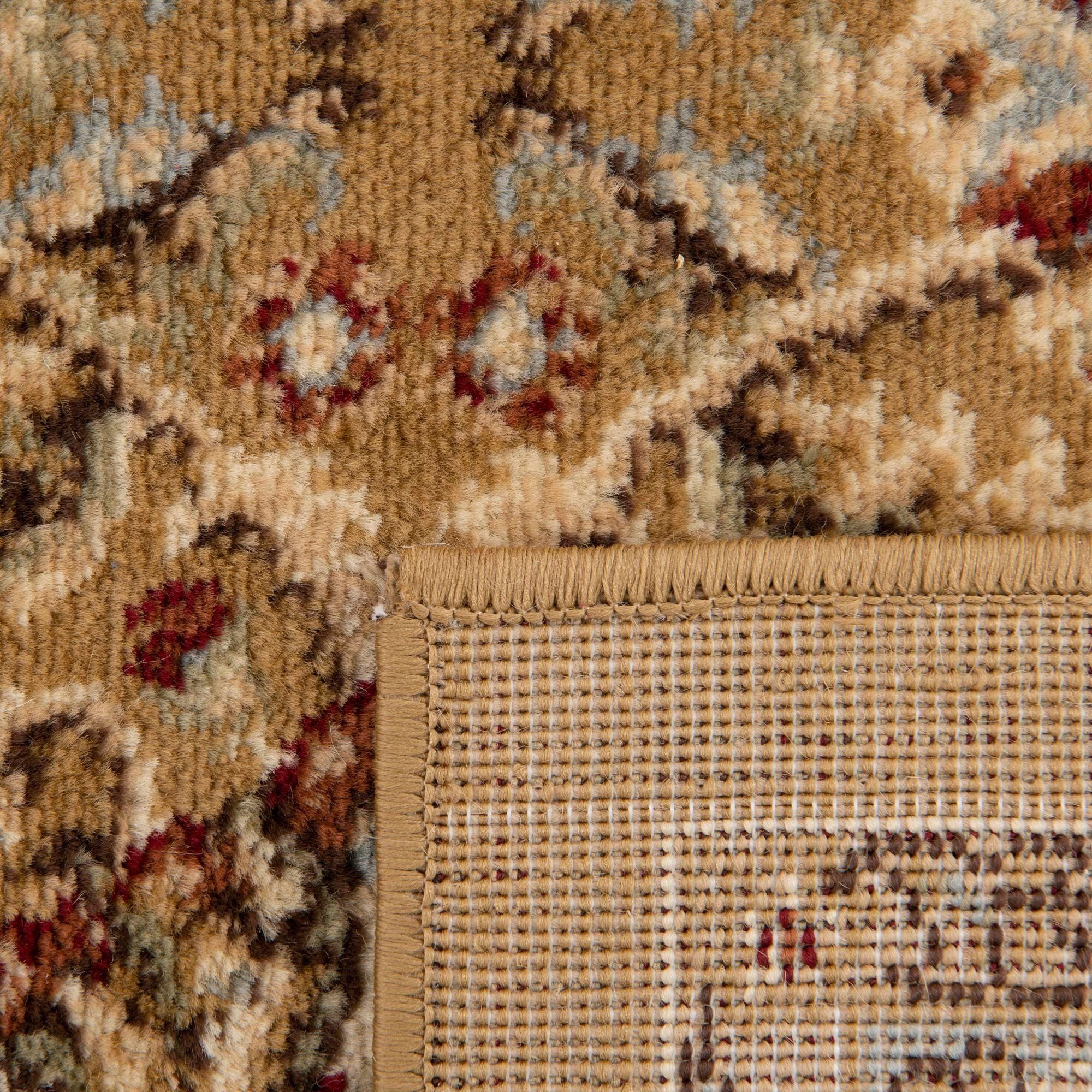 A traditional medallion and floral motif unfolds across a warm dark yellow ground, with scrolling vines, palmettes and finely detailed fillers in tan, light brown and brown. Light blue and peach highlights outline the border and inner motifs, while touches of red and light green add subtle contrast. Machine-made from 100% polypropylene, the rug has a low, dense pile that feels smooth and slightly cushioned underfoot, allowing the woven pattern to read with clear definition and soft dimensionality.