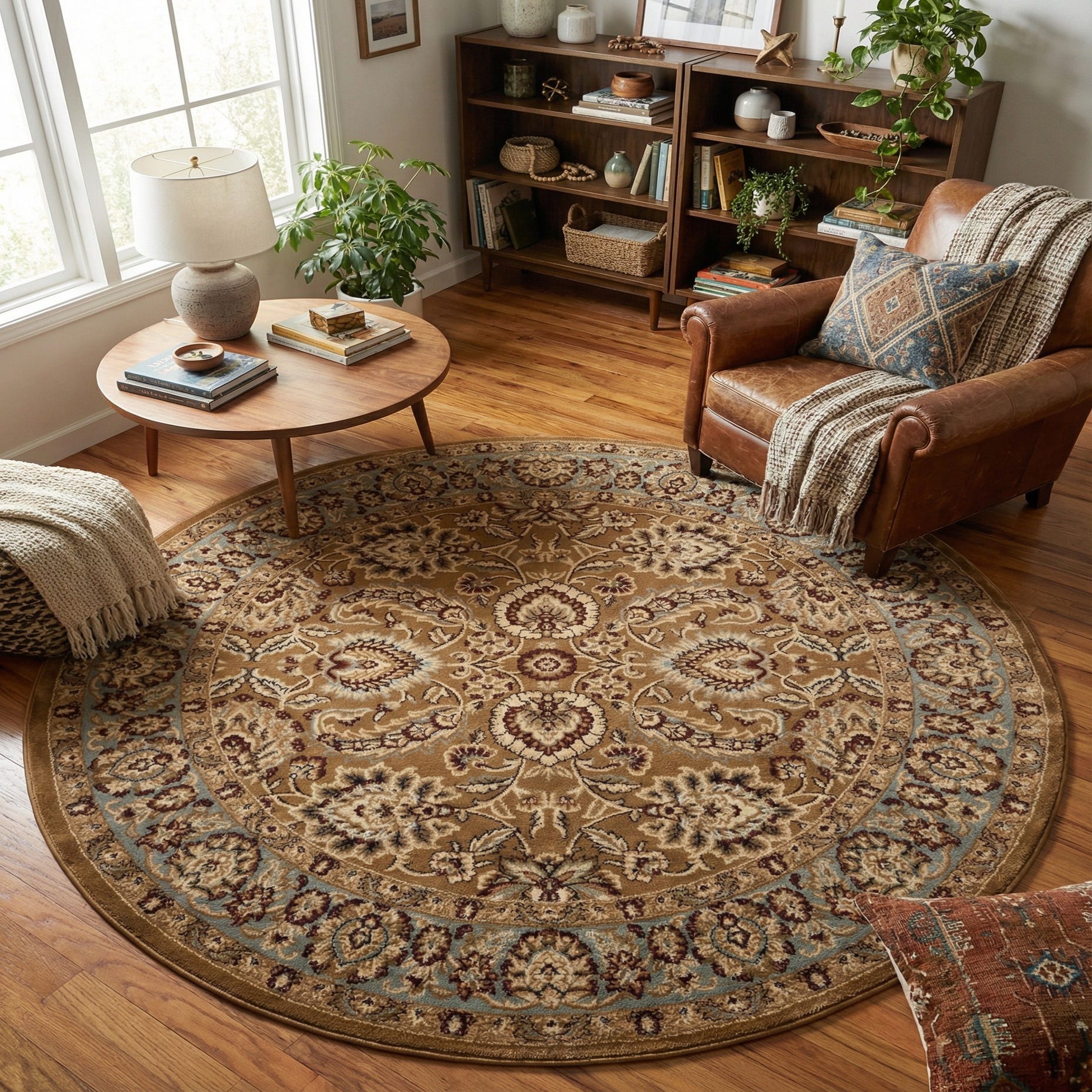 Machine made from 100% polypropylene, the rug has a low-to-medium pile with a dense, even surface that feels soft underfoot and shows a gentle, built-in sheen. That texture helps the detailed pattern remain crisp while offering a comfortable layer under seating. Use it to center a living area or reading nook, anchor a round dining table, or soften an entry with warm color and classic detail. It pairs naturally with warm wood furniture, neutral upholstery, leather accents and muted blue or cream textiles for an inviting, cohesive look.