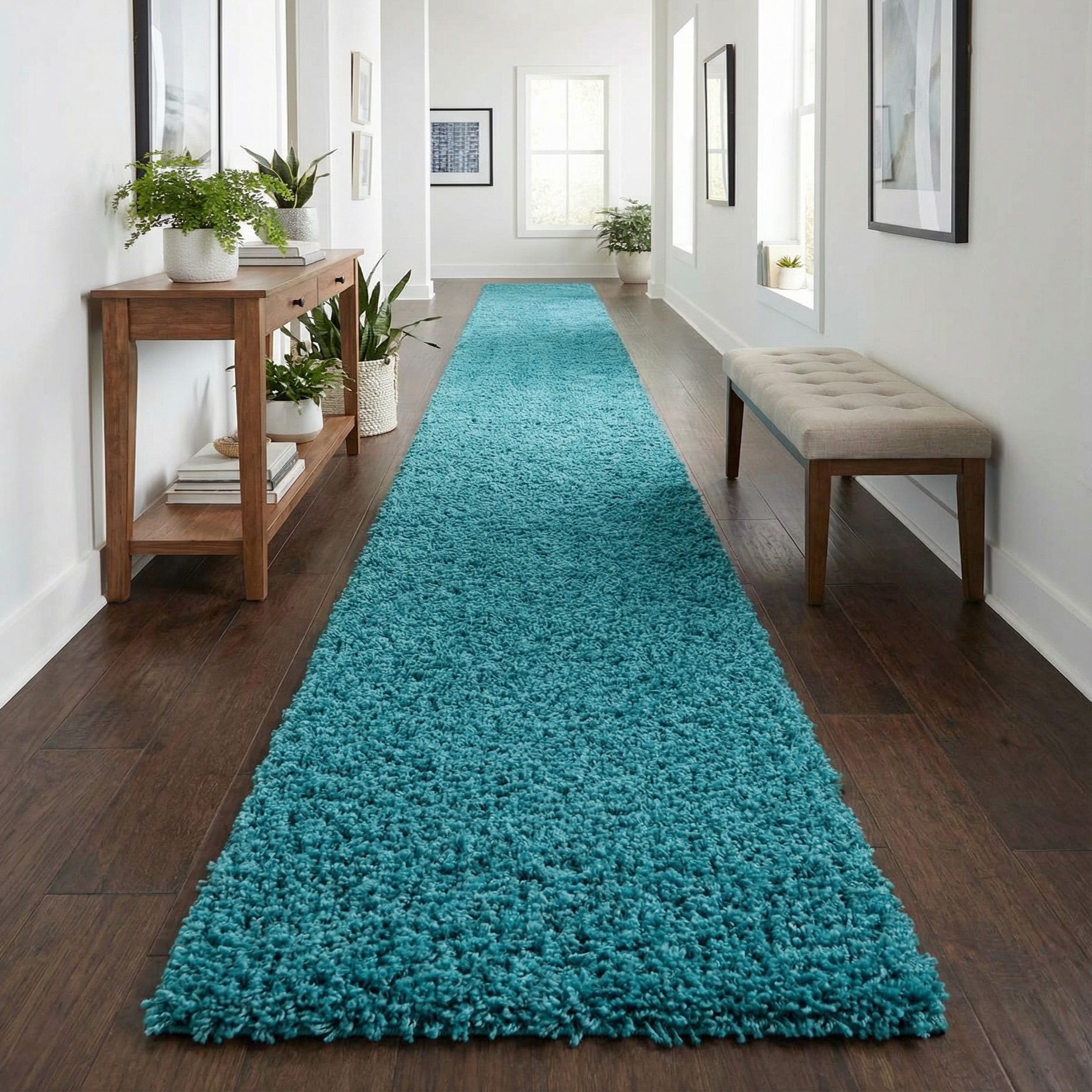 Underfoot the texture feels soft and springy—thick strands that cushion each step and create a cozy, relaxed atmosphere. As a long runner it’s ideal for hallways, entryways, galley kitchens, or alongside a bed, and pairs well with warm wood tones, crisp white trim, or neutral upholstery. The energetic aqua works particularly well in coastal, contemporary, mid-century modern, or eclectic interiors where you want a strong wash of color without added pattern.