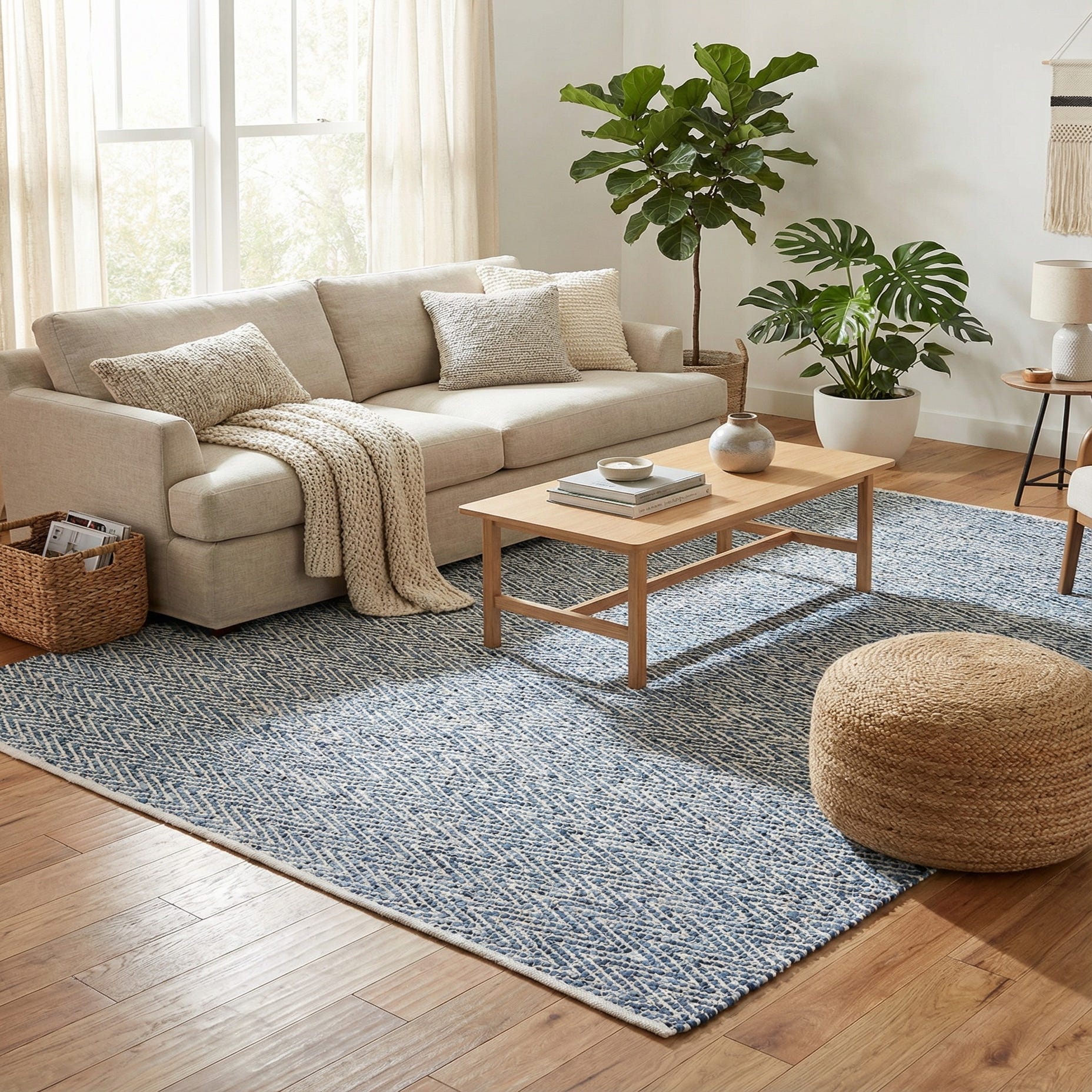 A 7x10 rectangular blue denim cotton rug with a textured chevron pattern, suitable for a living room.