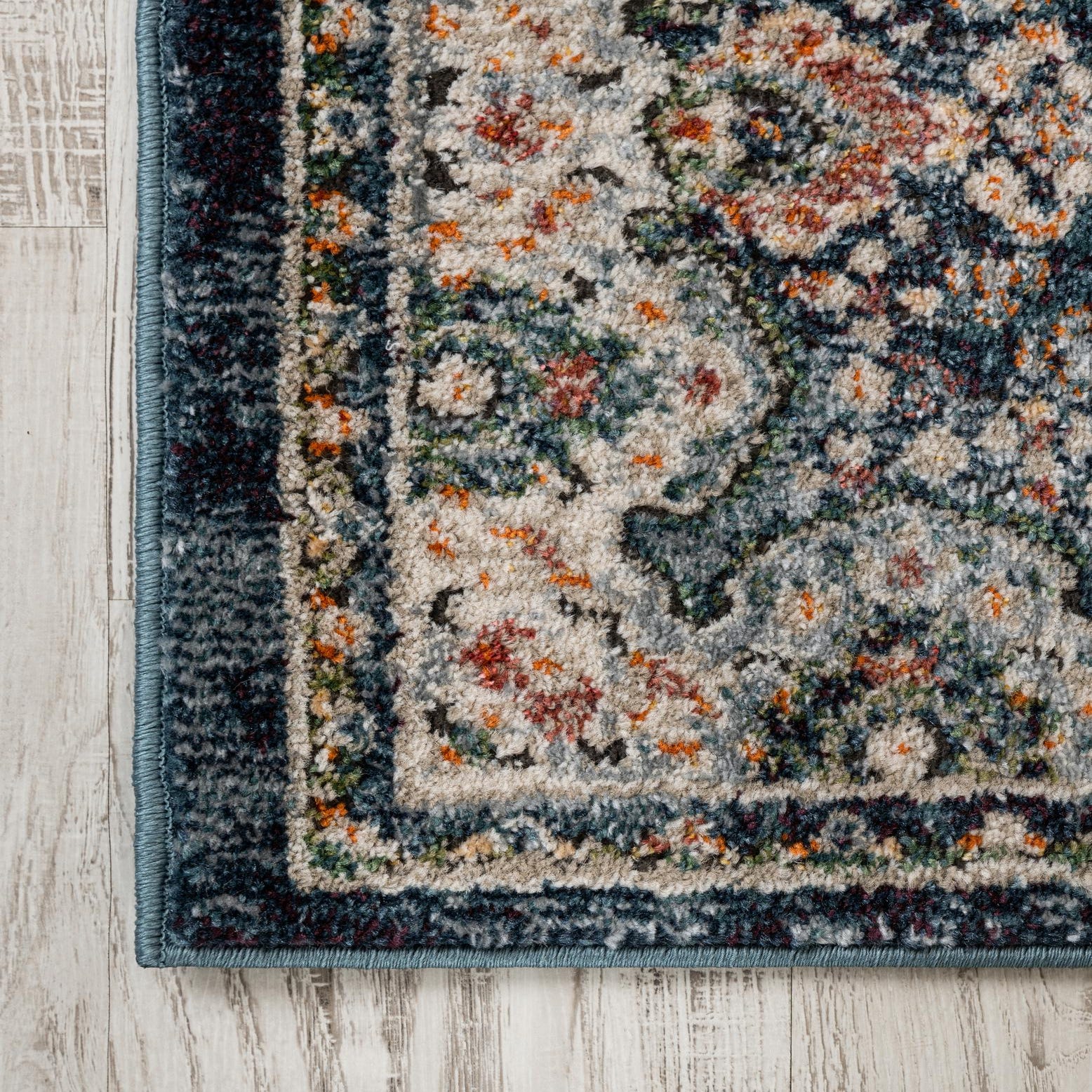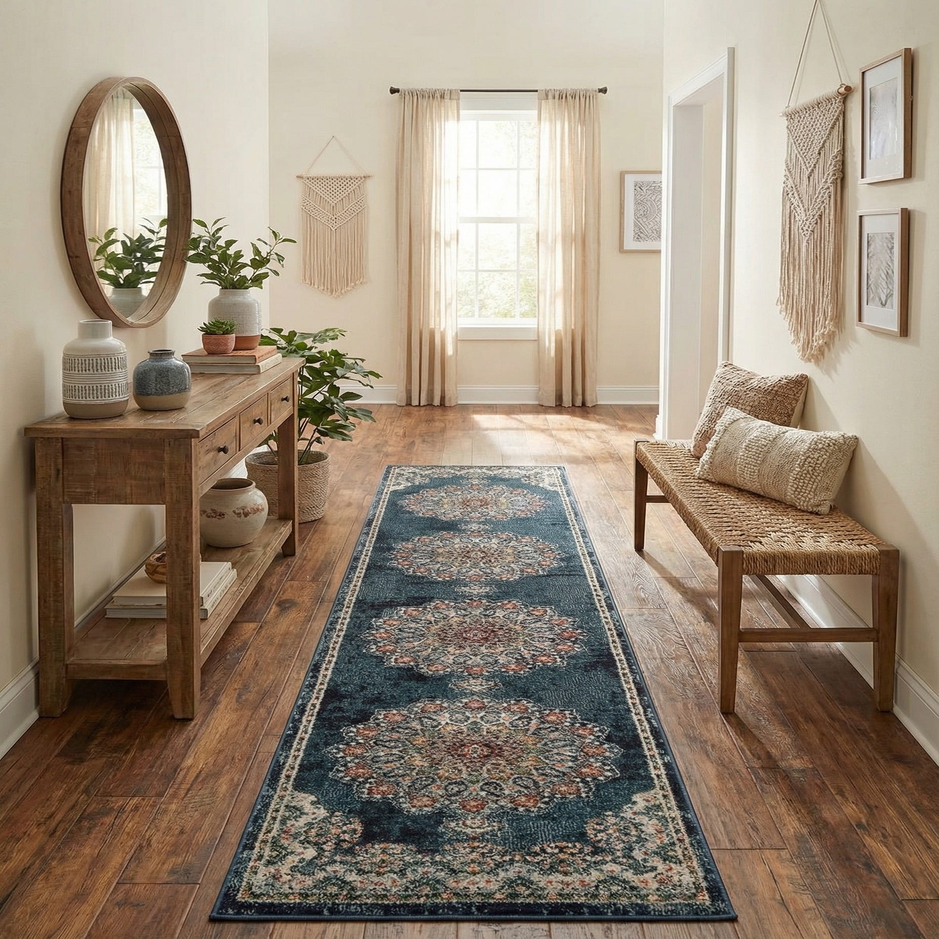 A long denim blue runner rug with an ornate traditional medallion pattern in orange, cream, and green, ideal for a hallway.