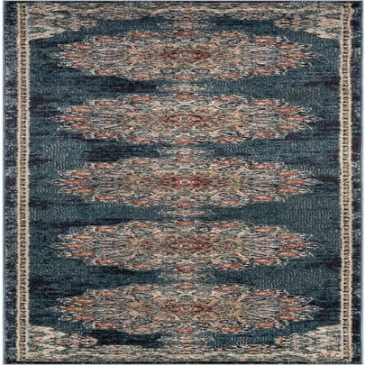 Primary color is Denim blue. Colors in this rug include: Denim blue, Beige, Green, Light Blue, Light Green, Navy Blue, Orange, Plum Red.