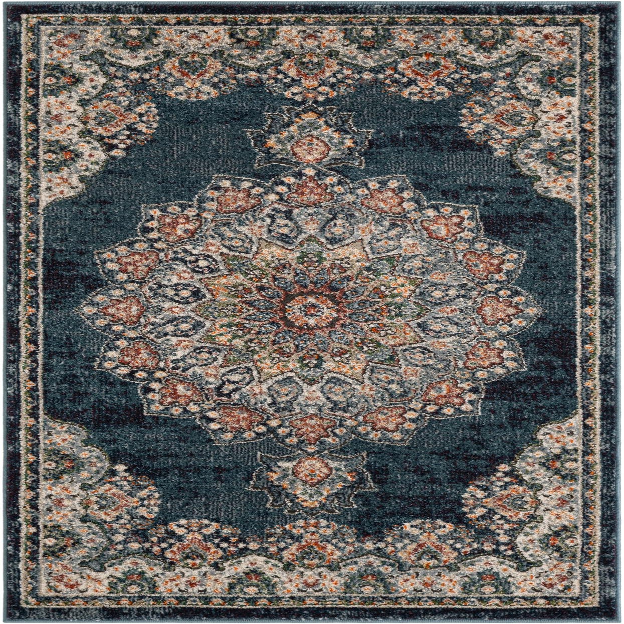 Primary color is Denim blue. Colors in this rug include: Denim blue, Beige, Light Blue, Light Green, Orange, Navy Blue, Green, Plum Red.