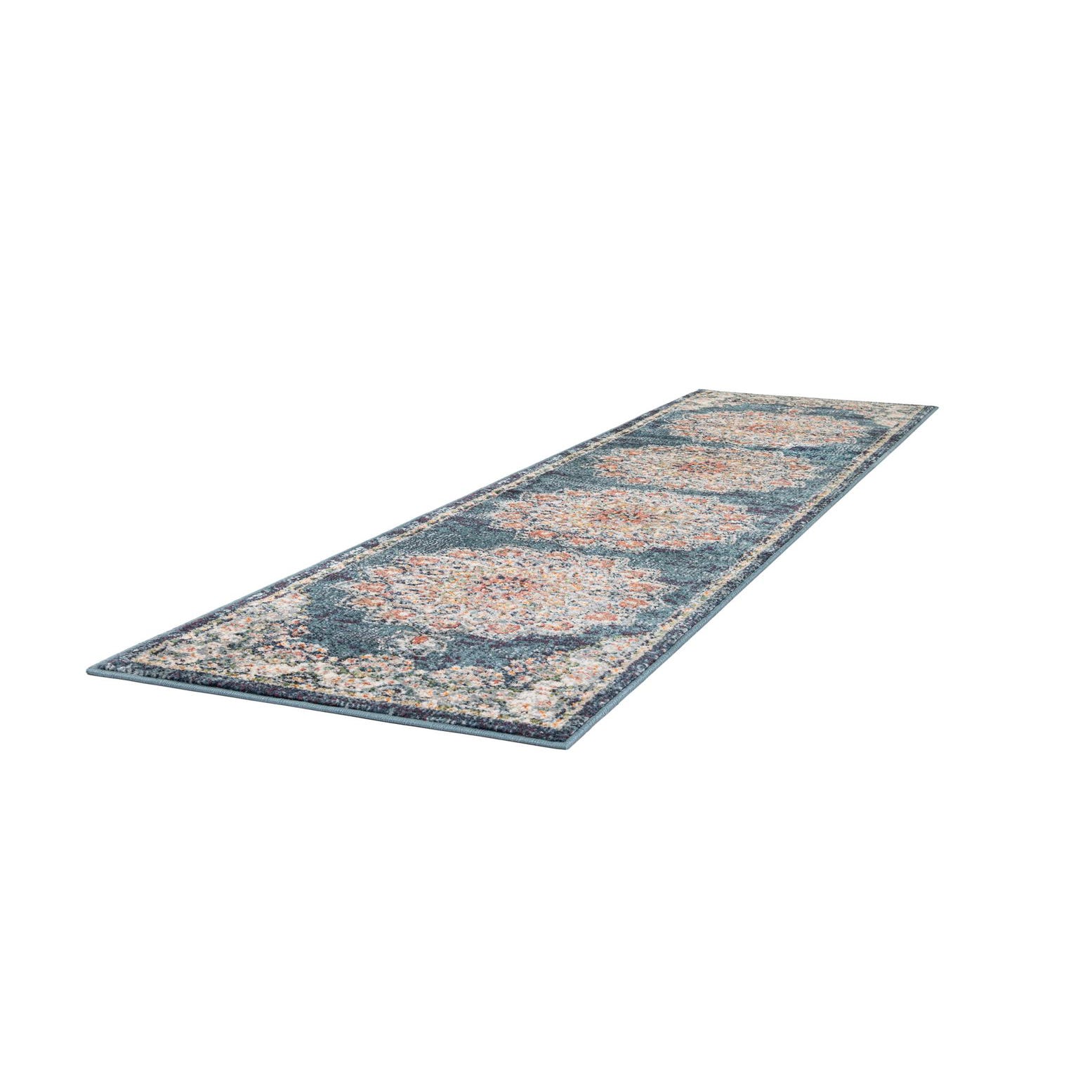 A long 8 ft runner rug in distressed denim blue with a repeating medallion pattern in cream, rust, and gold, ideal for a hallway.