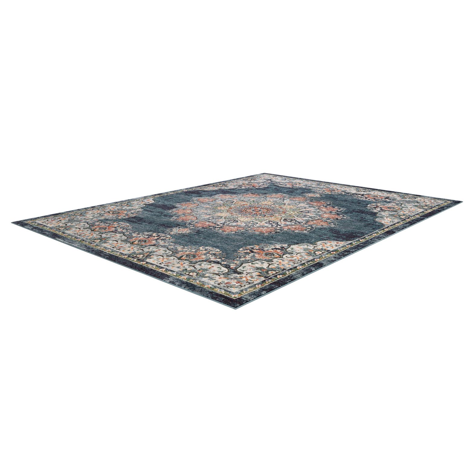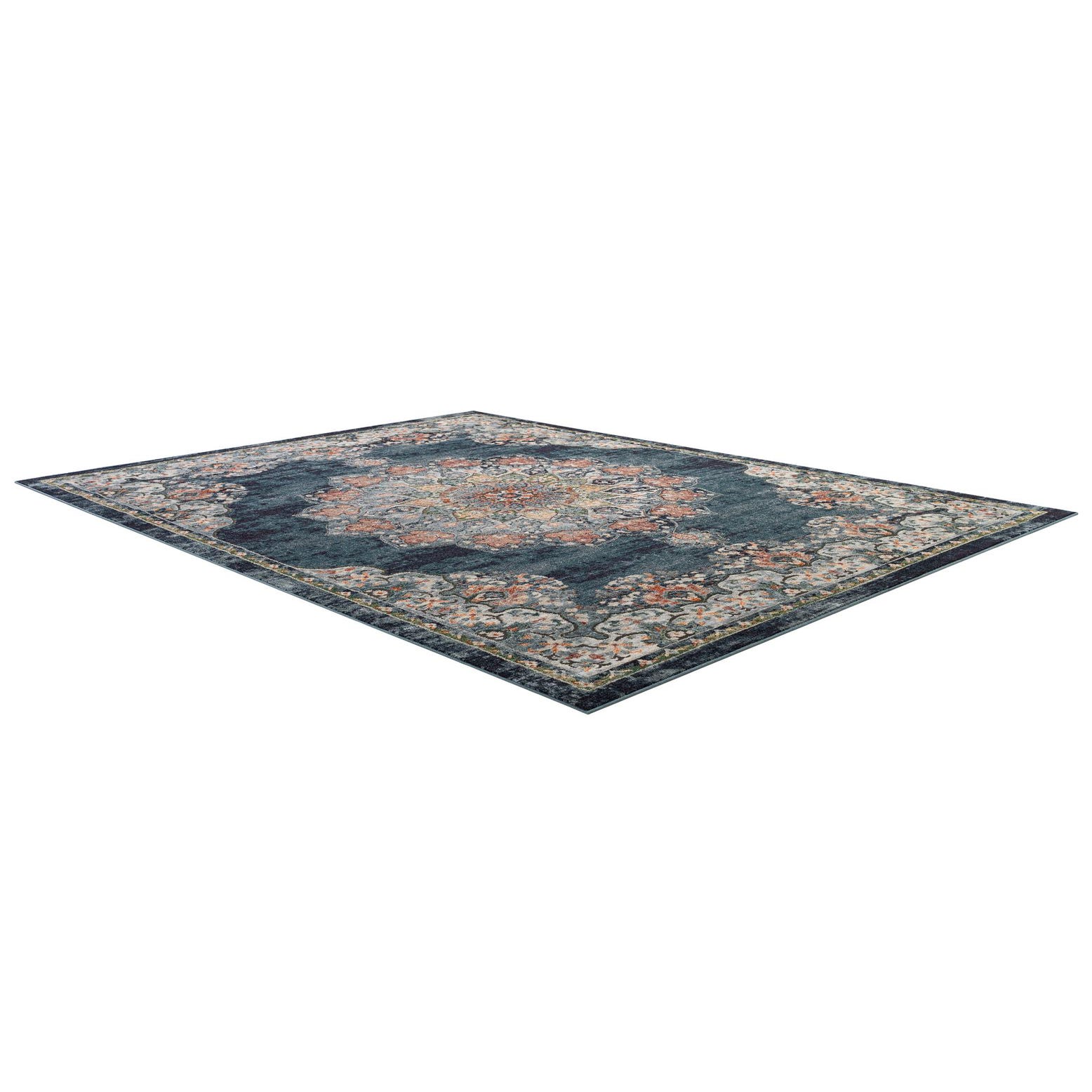 A classic medallion layout anchors this rug, with an ornate floral centerpiece surrounded by scalloped motifs and decorative corner spandrels. The denim blue ground sets a deep, even backdrop while a palette of beige, green, light blue, light green, navy blue, orange and plum red threads form the layered floral details and border flourishes. Machine made of polypropylene and polyester, the rug has a low, dense pile with a smooth hand and a subtle sheen that brings out the color depth and the slightly worn, vintage-inspired character.