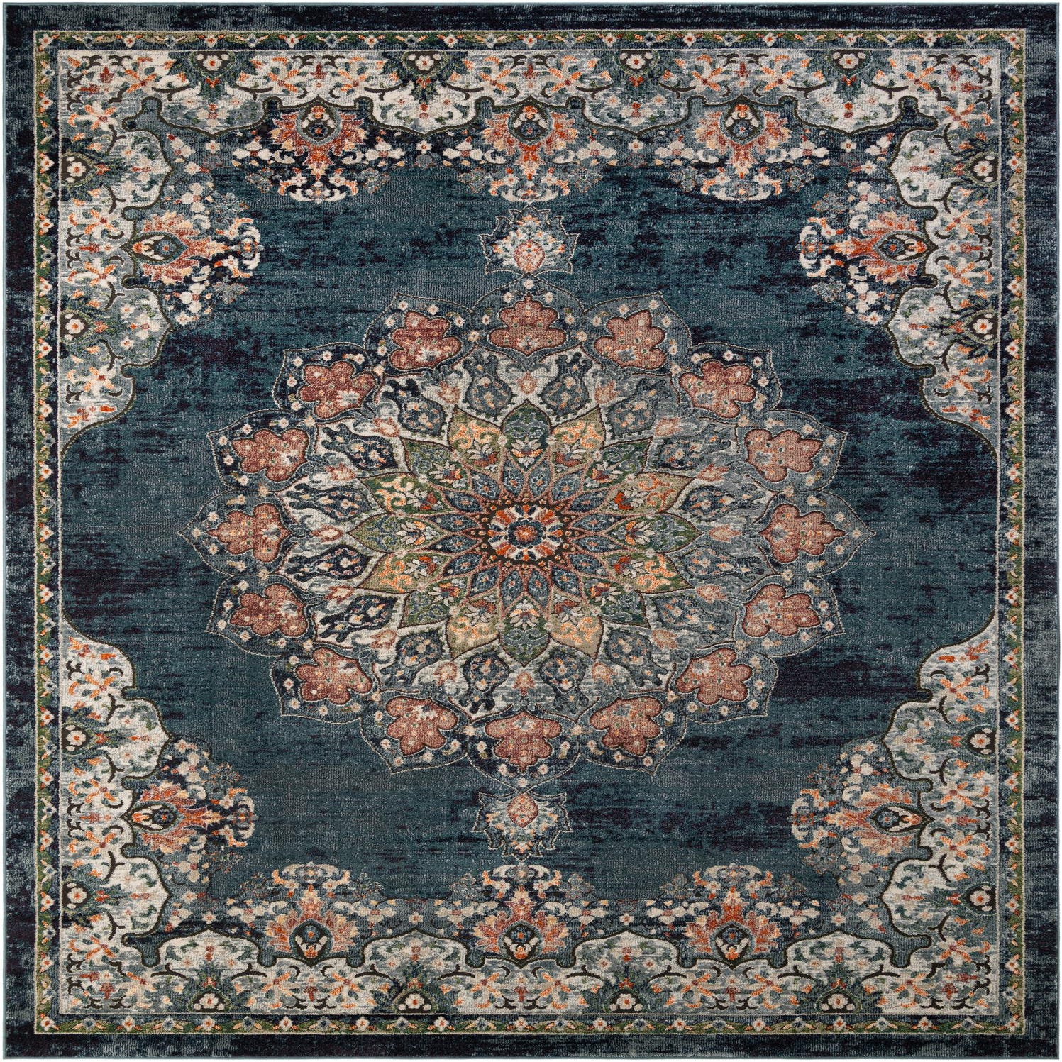 Primary color is Denim blue. Colors in this rug include: Denim blue, Beige, Green, Light Blue, Light Green, Navy Blue, Orange, Plum Red.