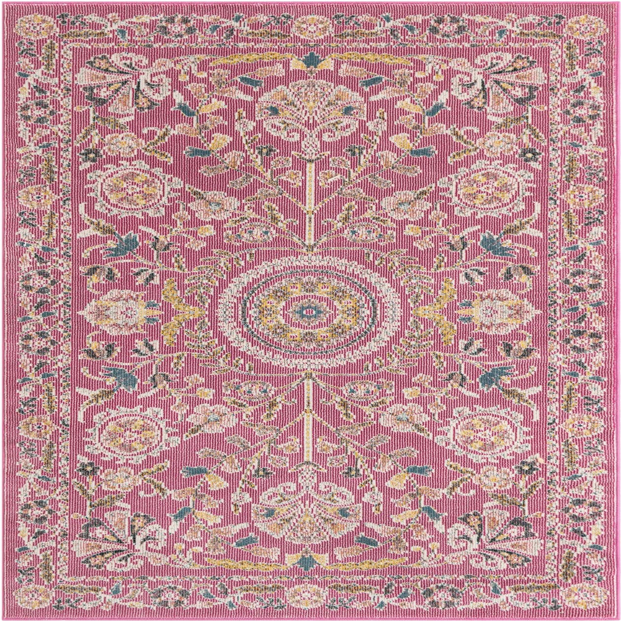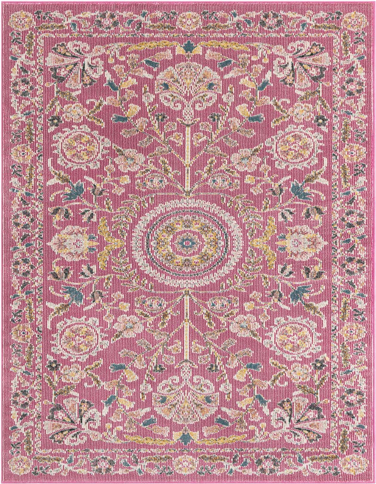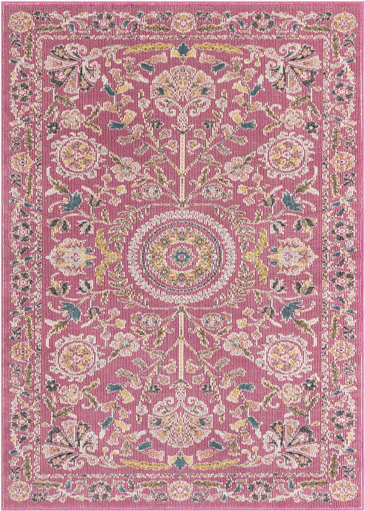 Primary color is Dusty Pink. Colors in this rug include: Dusty Pink, Ivory, Green, Yellow.