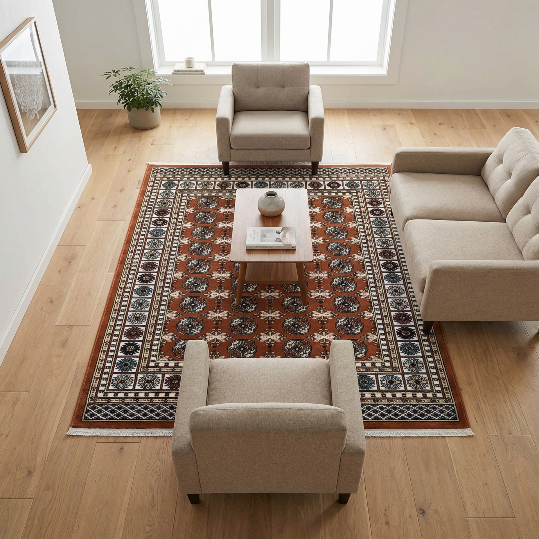 The rug’s traditional motif and gentle color palette work well in a range of interiors: anchor a compact living room or a small seating area, layer it beneath a bed to introduce color and softness to a bedroom, or use it to bring a vintage-inspired touch to a home office or reading nook. It pairs nicely with neutral upholstery, painted wood tones, and mixed-texture decor, and can temper bolder patterns while contributing a refined, lived-in look to transitional or eclectic schemes.