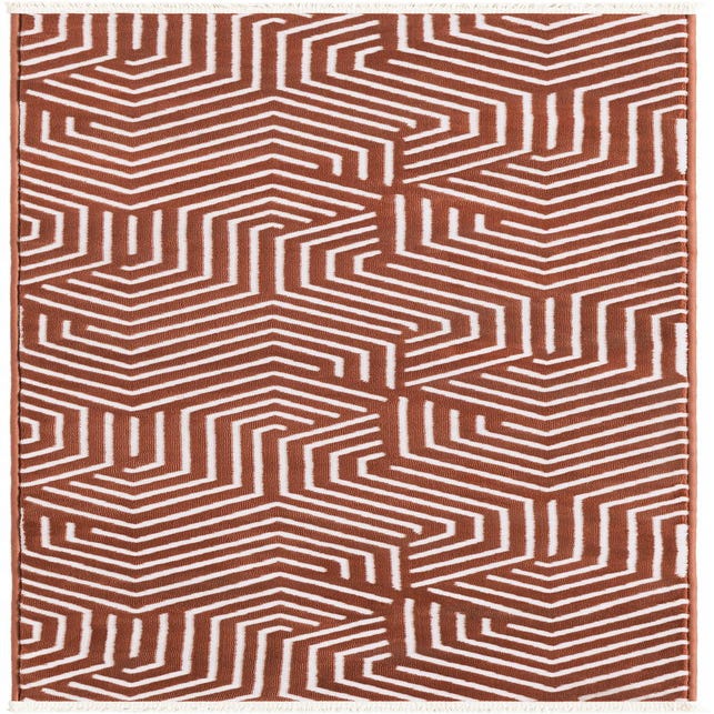 A 6 ft runner rug with a repeating geometric pattern of white lines on a terracotta pink background, featuring short white fringe.