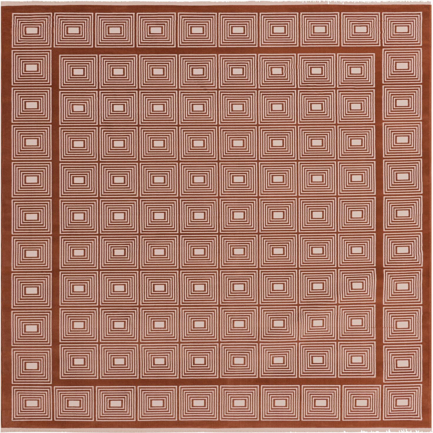 A rectangular 8x10 pink area rug with a repeating geometric pattern of concentric squares, framed by a solid border.
