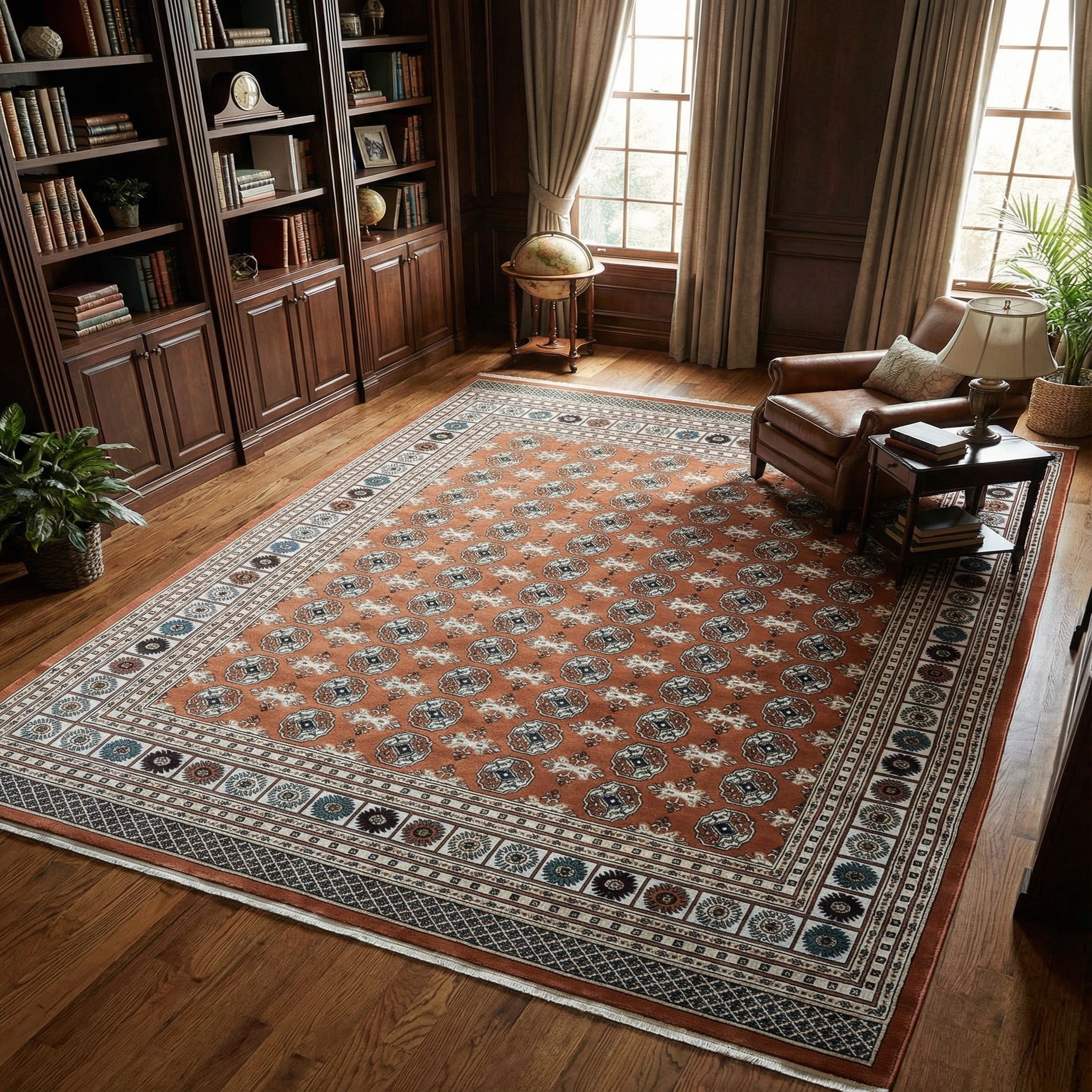 Warm and versatile, this rug works well beneath a living room coffee table to anchor seating, alongside a bed where its dusty pink warmth complements neutral linens, or under a dining table to add decorative interest without overwhelming the room. Pair it with warm wood furniture and navy or olive accent pieces for a pulled-together look, or use it as a colorful contrast against light, minimalist interiors to introduce pattern and depth.