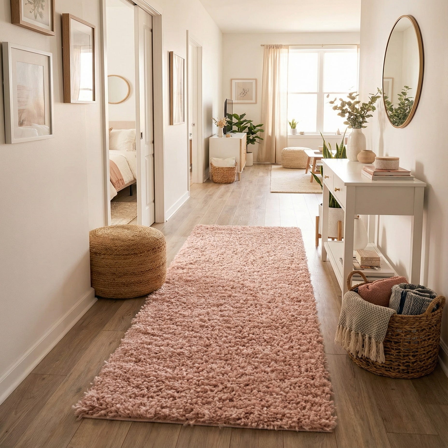 A soft pink 10 ft Zermatt Shag runner rug with a textured pile, perfect for a hallway.