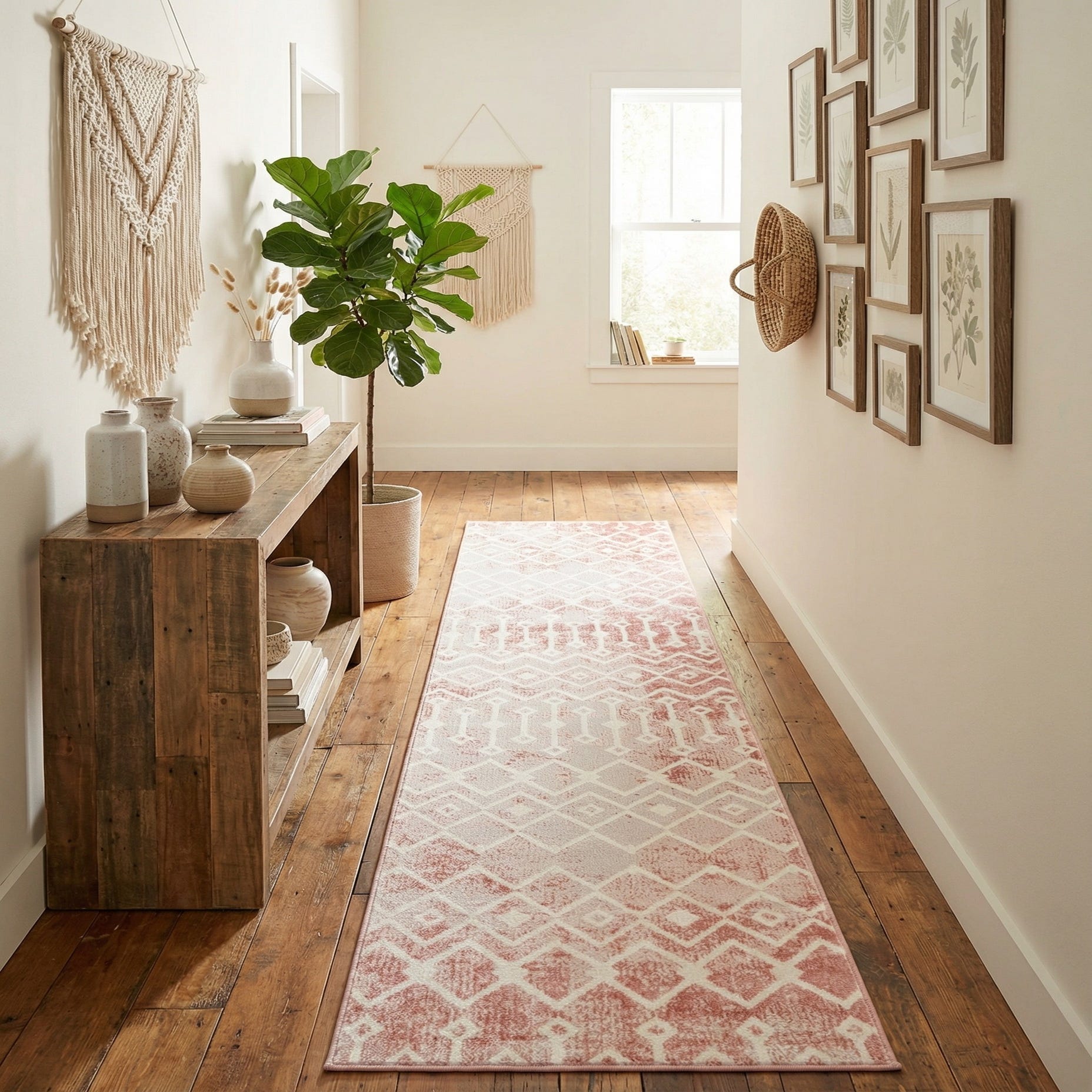 A 12 ft runner rug featuring a faded pink and white bohemian trellis pattern, ideal for a hallway.
