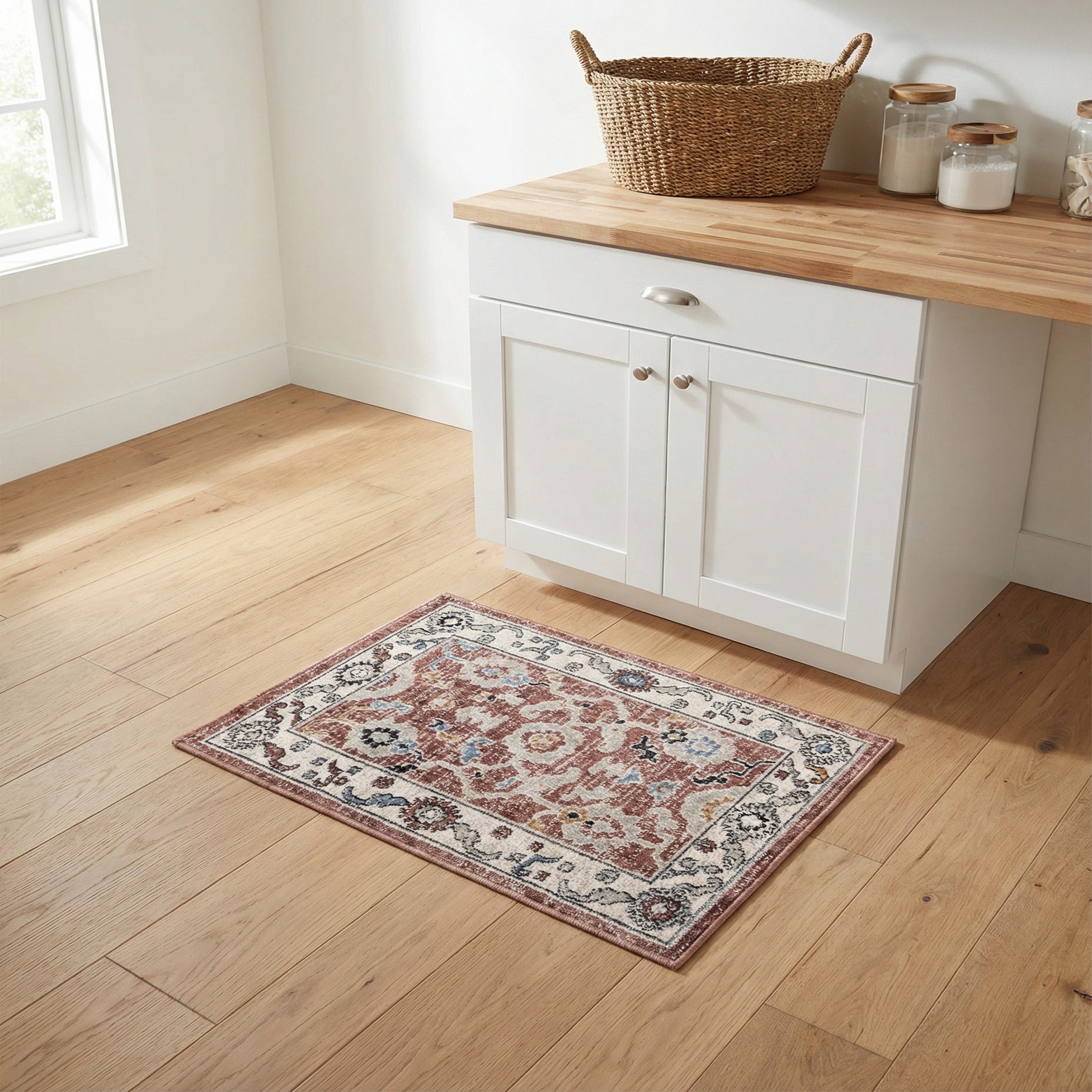 This compact piece works well as an entryway accent, bedside rug, or tucked into a small reading nook or kitchen landing to introduce warm color and pattern without dominating the room. It pairs naturally with warm woods, ivory or gray upholstery, and black metal accents, and complements transitional, cottage, vintage-inspired, and modern farmhouse interiors. Use it layered over a larger neutral rug or alone to anchor a cozy vignette.