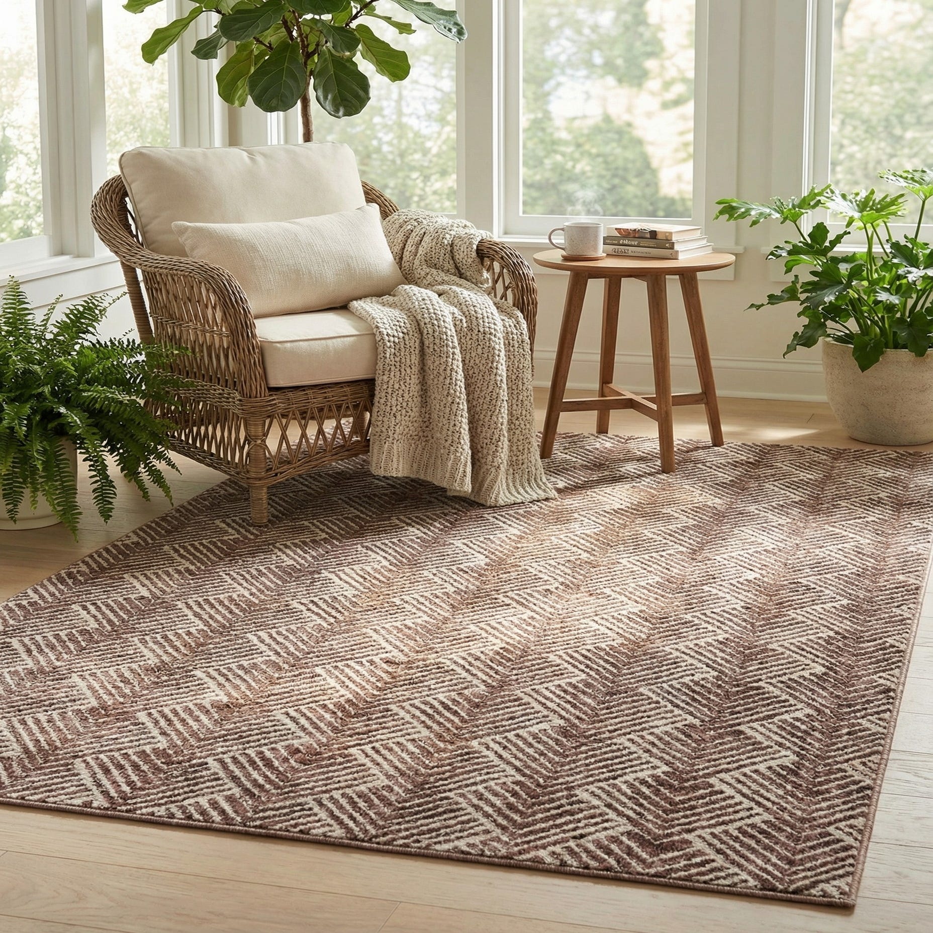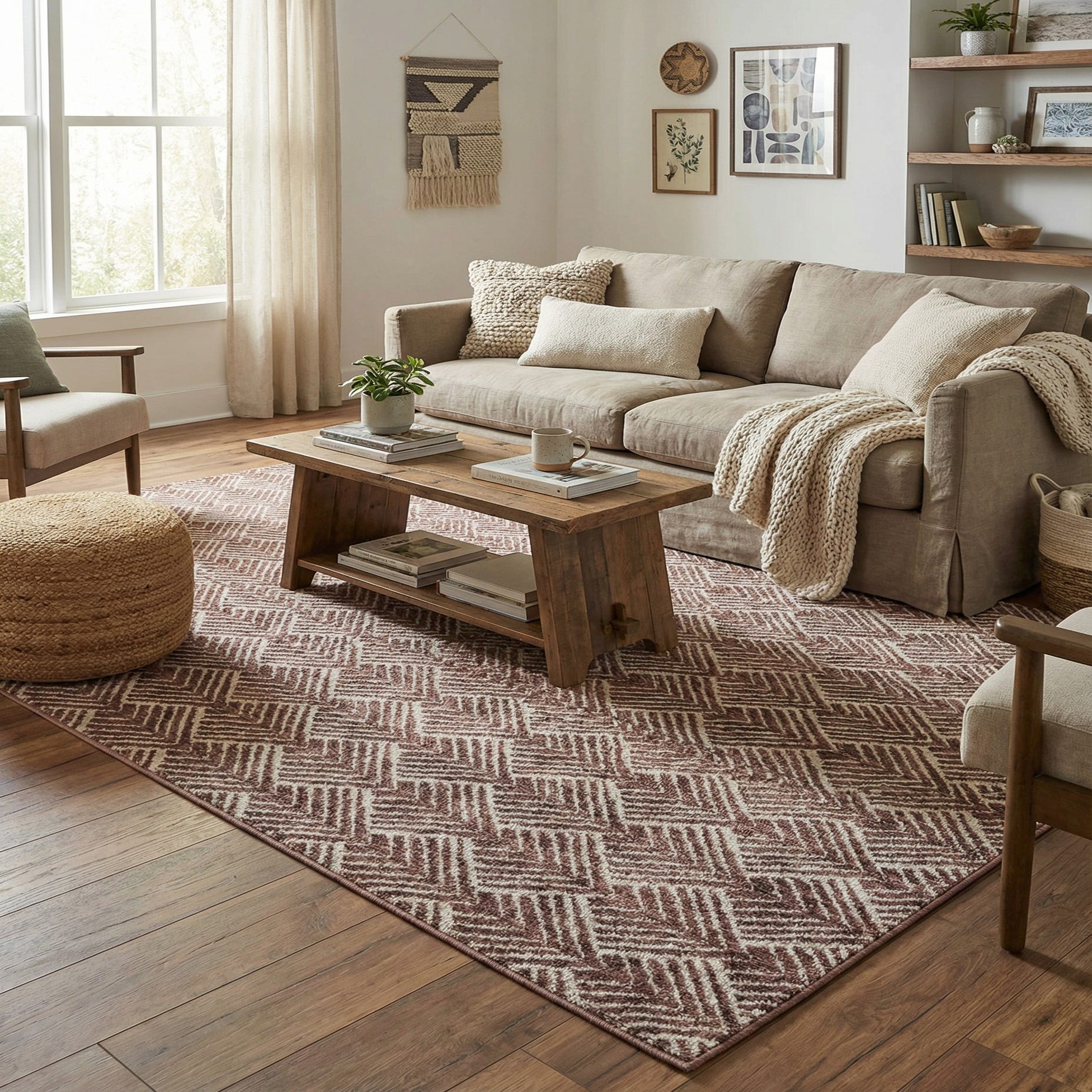 Works beautifully with light wood furniture and warm neutrals in a living room seating area, or layered under a bed to add a calm, patterned foundation to a bedroom. It pairs well with transitional, Scandinavian, or softly feminine interiors—try it in a reading nook or nursery with ivory textiles and mixed metal accents, or use it to introduce a muted blush into an otherwise neutral scheme.