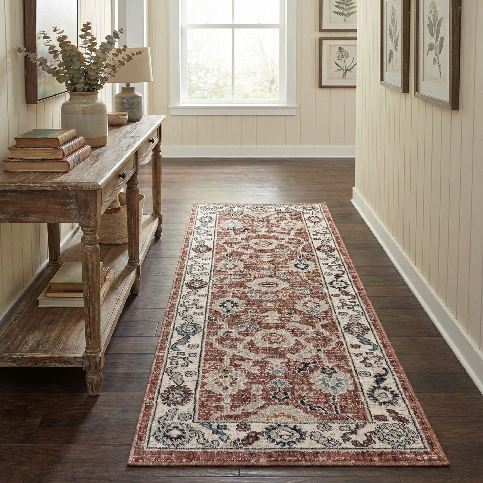 This runner works well in transitional and vintage-inspired interiors — place it in a hallway or entry to anchor a space with warm color, or layer it in a bedroom alongside hardwood or painted floors. Pair with neutral linens, warm wood tones and muted blues for a cohesive palette, or use it to soften an industrial or modern space with its classic motifs and lived-in appearance.