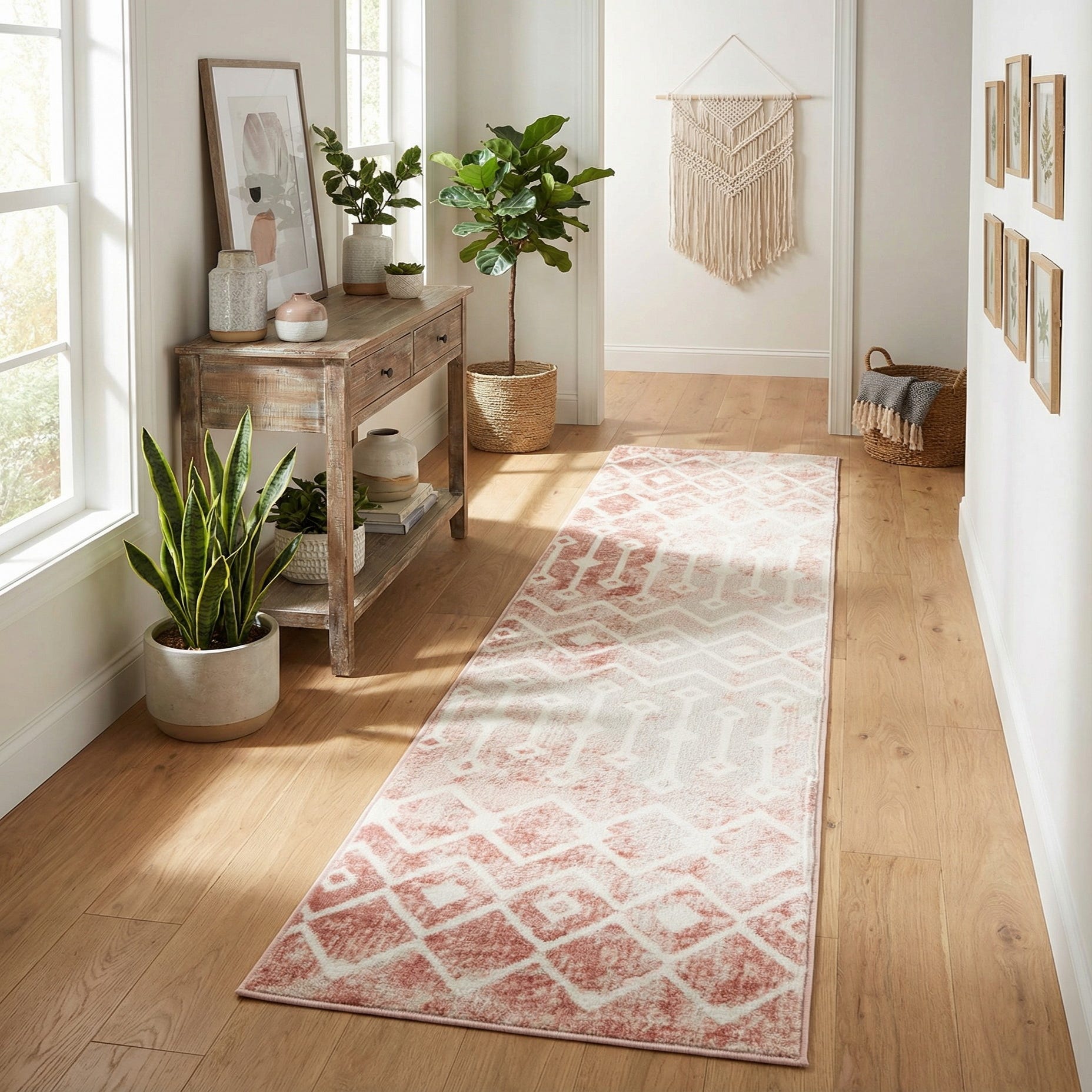 The pile has a low-to-medium profile with a smooth, slightly cushioned hand that feels pleasant underfoot and shows the pattern through gentle texture rather than high loops. Machine made of 100% polypropylene, the construction delivers a consistent surface and stable weave suited to busy walkways. Place this runner in a hallway or entry, alongside a bed, or down a narrow kitchen corridor; it coordinates well with light wood floors, ivory or gray upholstery, and brass or matte-black accents in styles from modern farmhouse and Scandinavian to soft boho or cottage-inspired interiors.