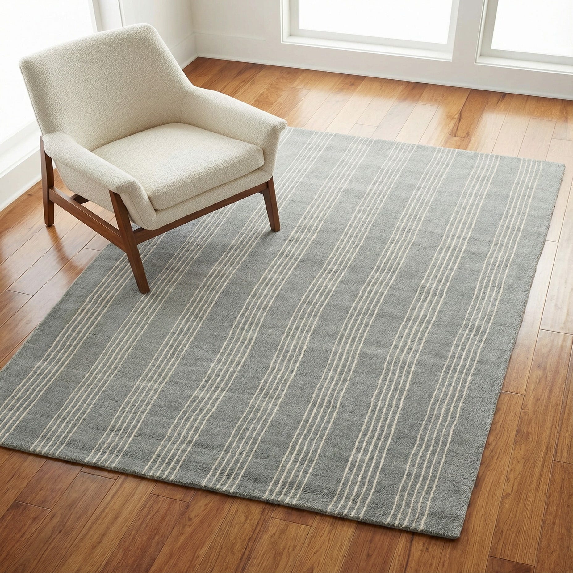 A 4x6 rectangular gray wool rug with thin vertical cream stripes, suitable for a modern living room.