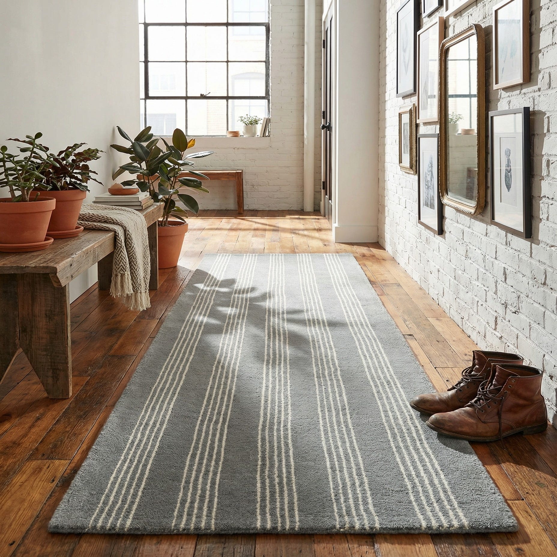 A 6 ft runner rug with a modern gray background and vertical white stripes, ideal for a hallway.