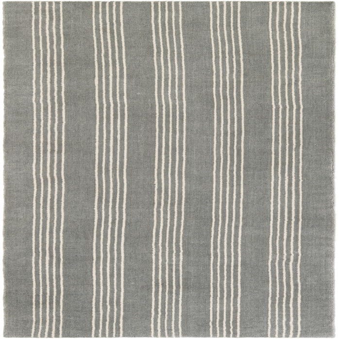 A handmade 8 ft runner rug featuring a modern gray background with evenly spaced vertical white stripes, ideal for a hallway.