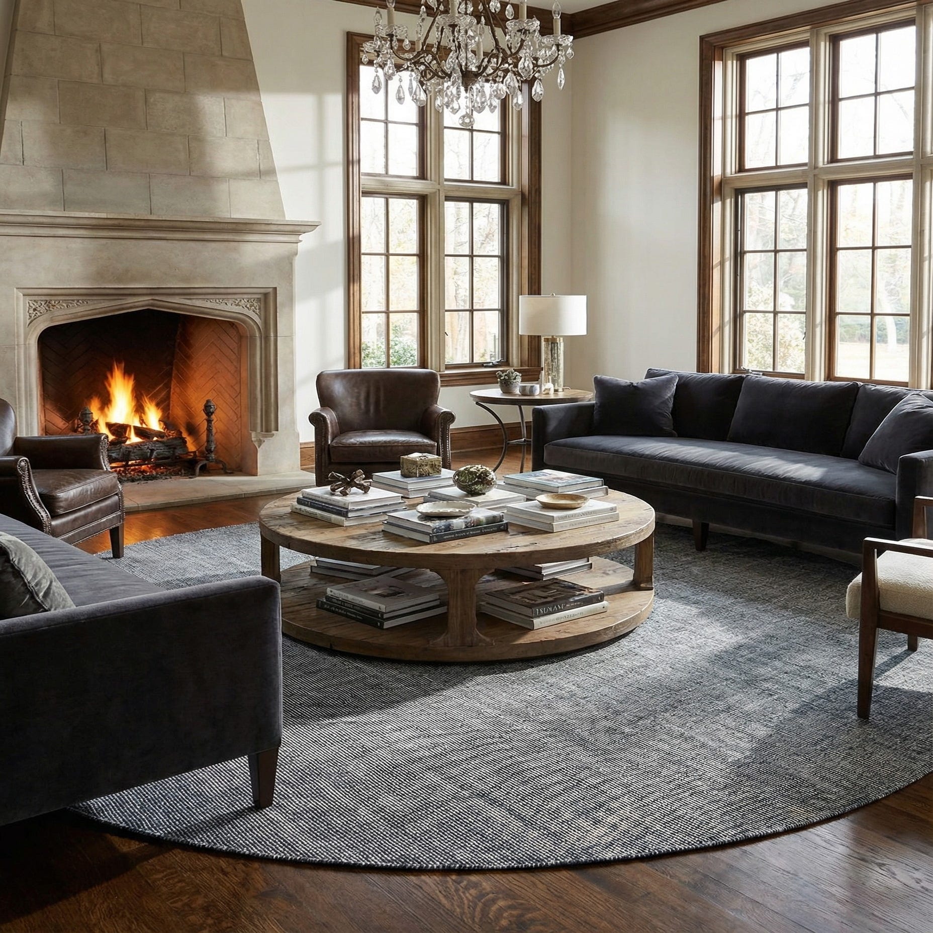 Place it beneath a round dining table to emphasize the shape of the room, anchor a seating area with a sectional and minimalist coffee table, or use it to soften a master bedroom with warm wood furniture and linen bedding. It pairs beautifully with warm wood tones, black metal accents, leather seating, and soft textiles—suiting contemporary, Scandinavian, modern farmhouse, or industrial interiors where a quiet, textural foundation is desired.