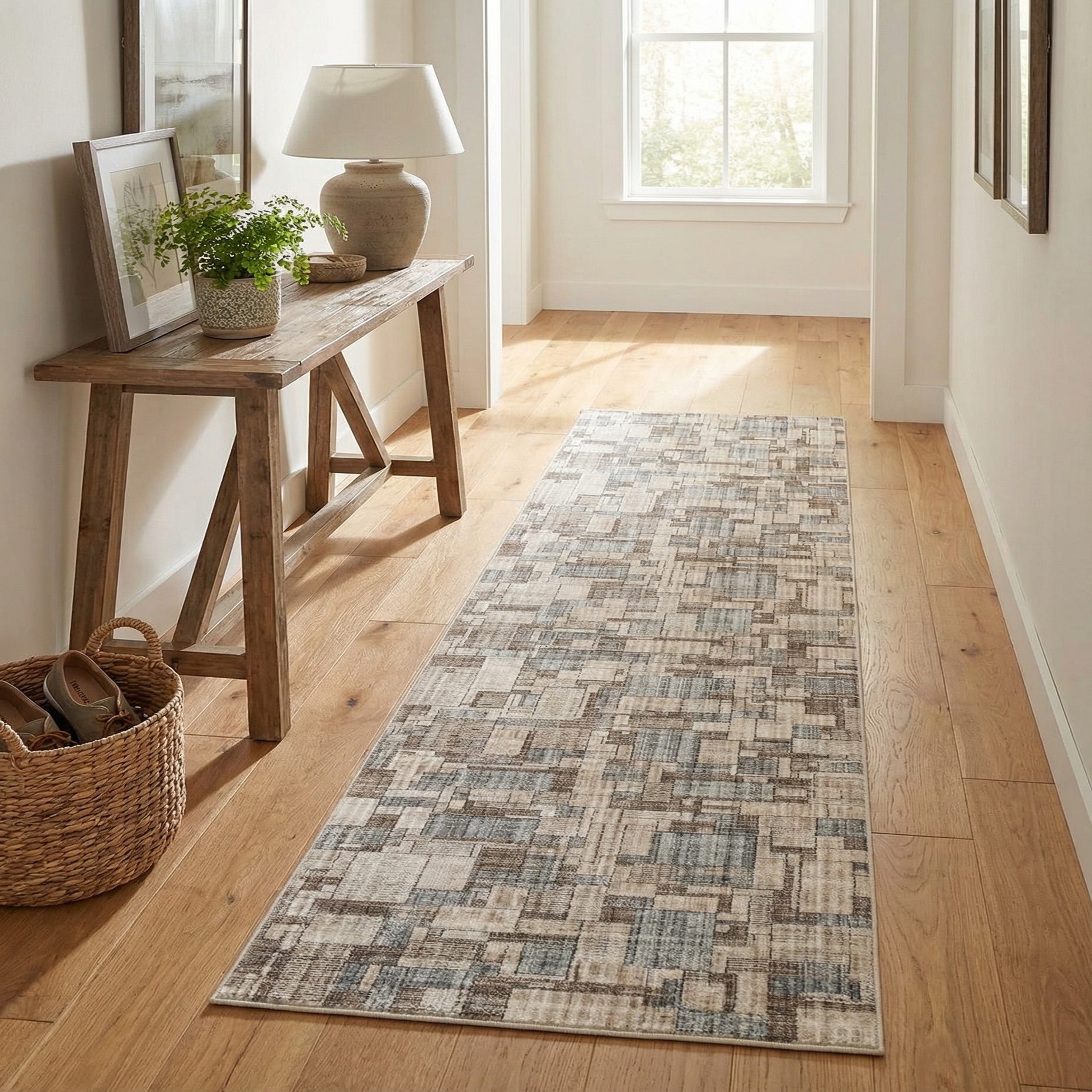 A 12 ft runner rug with a modern geometric pattern in shades of brown, tan, and white, suitable for a hallway.
