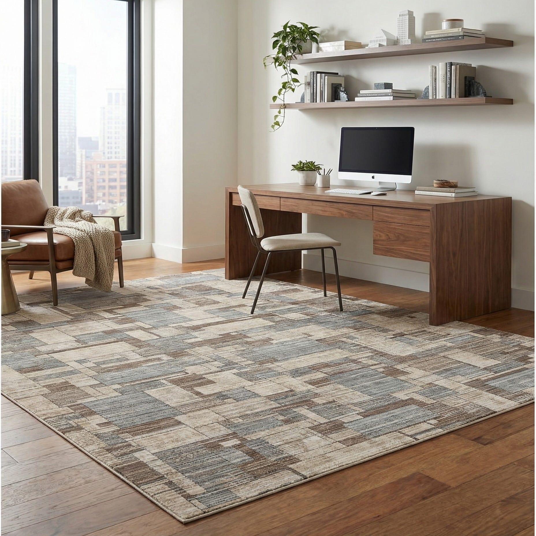 A rectangular 8x10 indoor rug featuring a modern abstract geometric pattern in shades of brown, tan, and off-white.