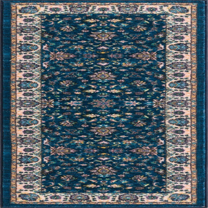 Primary color is Egyptian Blue. Colors in this rug include: Egyptian Blue, Black, Blue, Beige, Green.