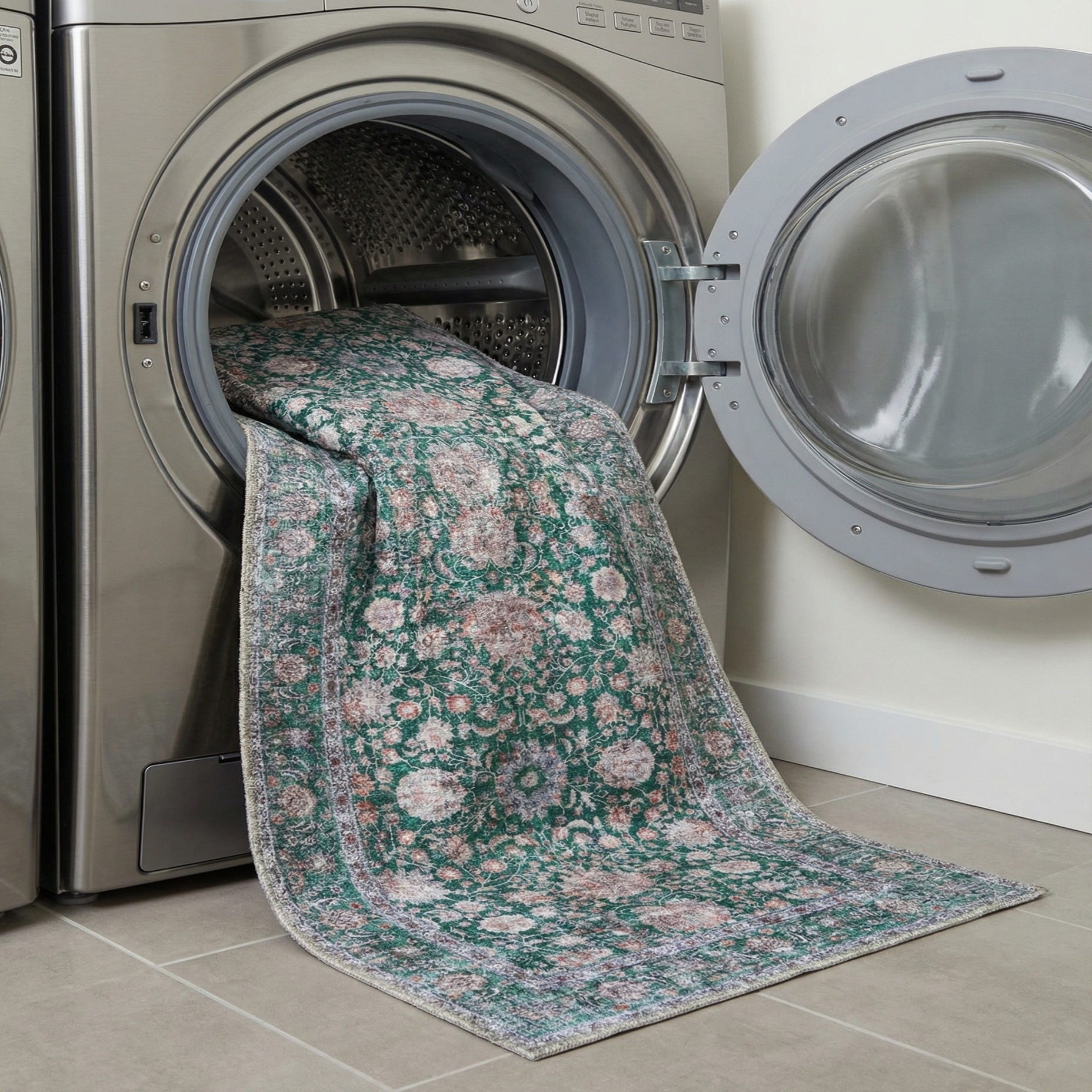 Hand-knotted looks get an easy, lived-in feel in this machine-made runner crafted from polyester and chenille. An emerald green field sets the stage for an overall Persian-inspired floral pattern: scrolling vines, palmettes and repeating medallion motifs in ivory and beige with soft blue and brown accents. The detailed inner and outer borders frame the central design, and a subtle distressed finish gives the pile a gently worn, vintage character you can feel underfoot.