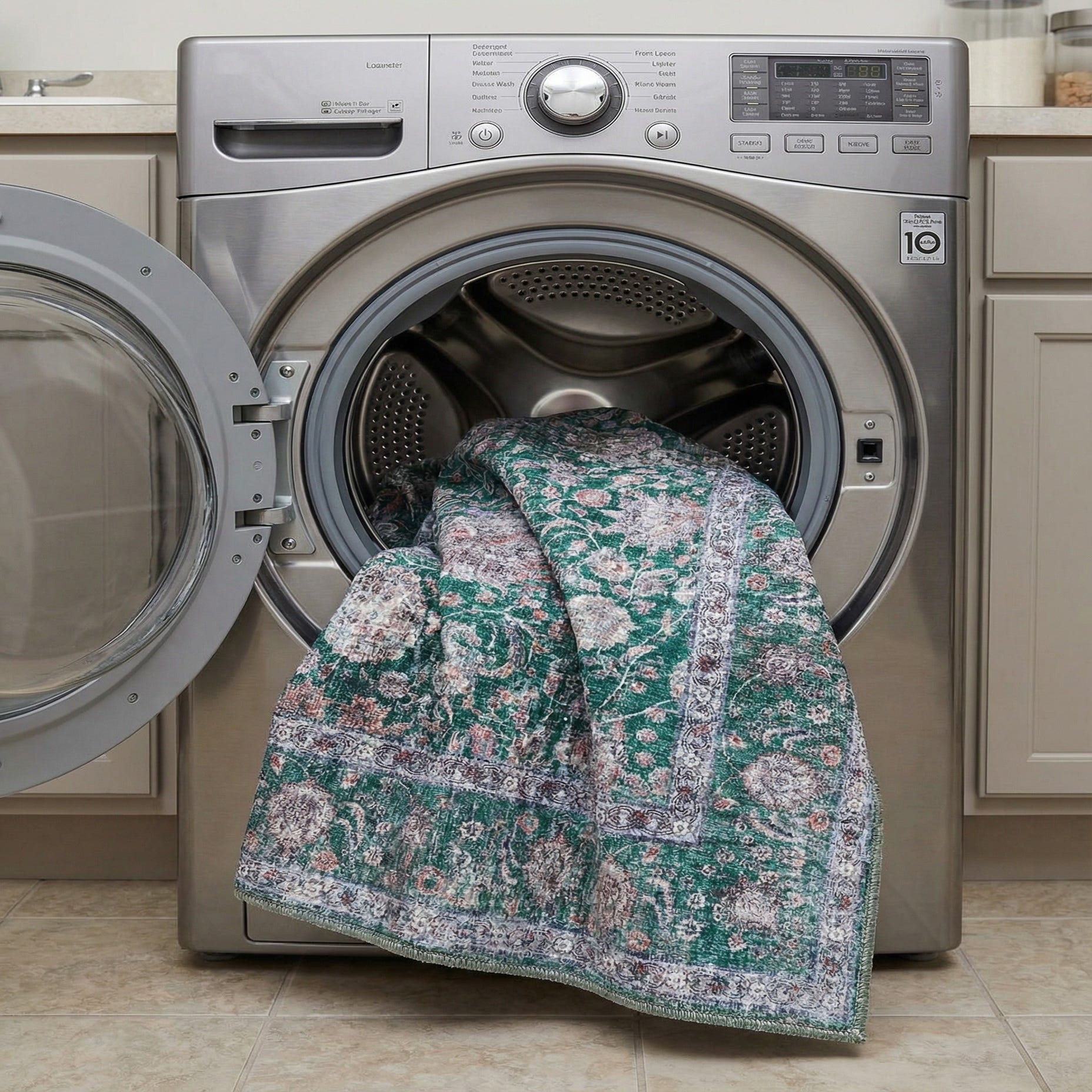 A Persian-inspired floral medallion unfolds across a rich emerald green field, where scrolling vines and clustered blossoms form a layered, vintage-look pattern. Soft ivory and beige highlights define the central motifs, while touches of blue and brown add depth and contrast against the green background. Machine made from polyester and chenille, the surface has a low-profile, velvety hand—chenille provides a gentle, tactile softness while the polyester foundation keeps the texture smooth and resilient. A subtly distressed finish gives the design an aged character without losing clarity in the floral details.