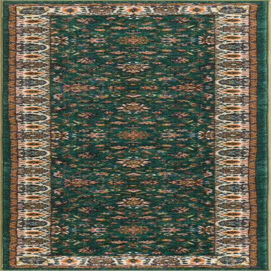 Primary color is Emerald Green. Colors in this rug include: Emerald Green, Ivory, Terracotta, Orange, Peach.