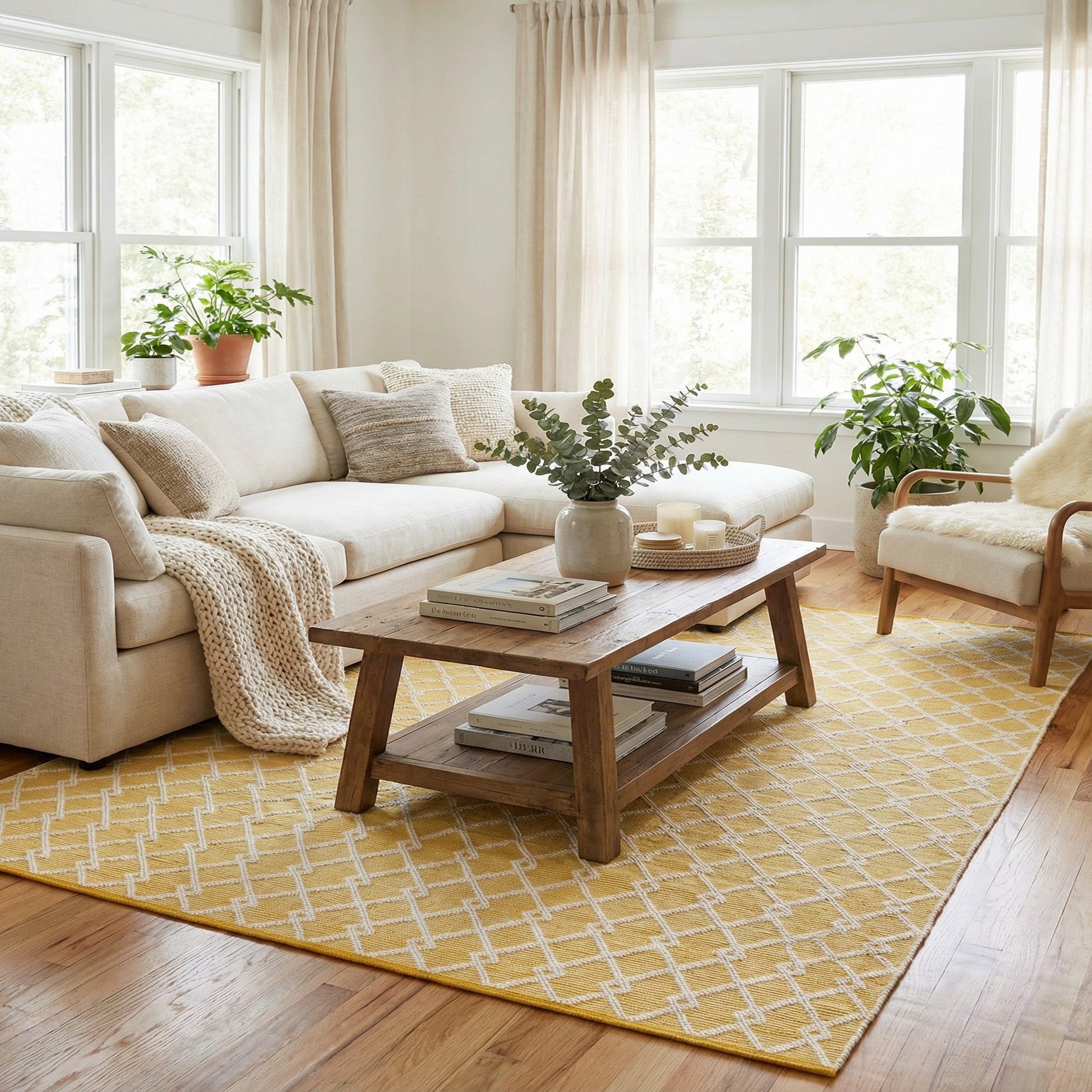 The bright, warm English Daisy color brings energy to living rooms and family spaces, while the ivory lattice keeps the overall look light and versatile. Pair it with natural wood furniture and neutral upholstery for a relaxed, cottage or coastal vibe, or use it to inject color and pattern into a contemporary or transitional room alongside navy, gray, or warm metallic accents. It also layers well over a neutral flatweave for added depth in larger seating areas or under a dining table to lift the dining room palette.