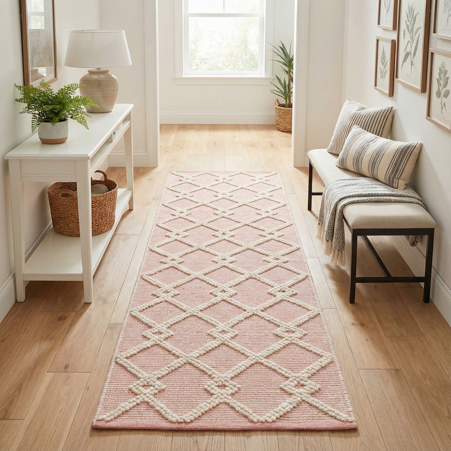 This runner works well in a light-filled hallway, at the foot of a bed, or along a galley kitchen to add a gentle, feminine touch without overpowering a room. It pairs naturally with painted white or warm oak floors, linen upholstery, and brass or matte-finished accents, and suits interiors leaning toward modern farmhouse, Scandinavian, or casual French country.