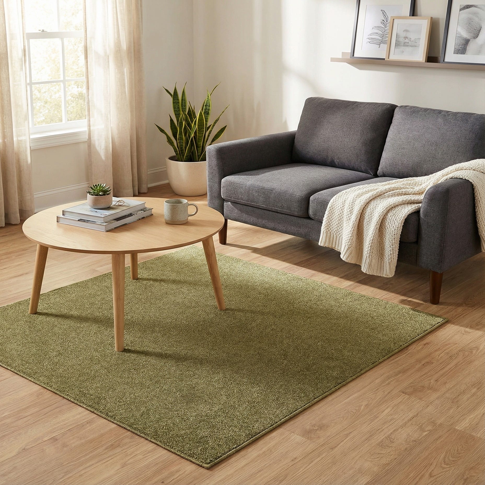 Underfoot the pile feels smooth with a touch of cushion, good for steady traffic areas where you want a refined yet relaxed foundation. Pair it with light wood furniture and white or cream upholstery for a fresh, Scandinavian-inspired room, layer it beneath a compact dining table in a casual kitchen, or use it to anchor a home office with metal and glass accents. It also complements mid-century pieces and brass finishes, bringing a muted green backdrop that ties a room’s color palette together.
