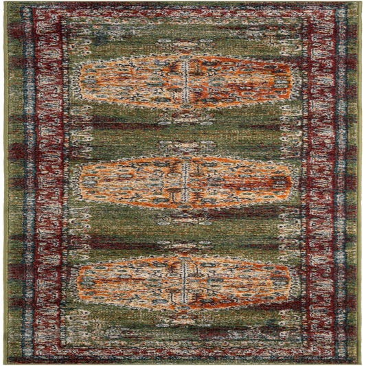 Primary color is Fern Green. Colors in this rug include: Fern Green, Beige, Black, Blue, Brown, Hunter Green, Ivory, Light Blue, Navy Blue, Orange, Peach, Plum Red, Purple, Red.
